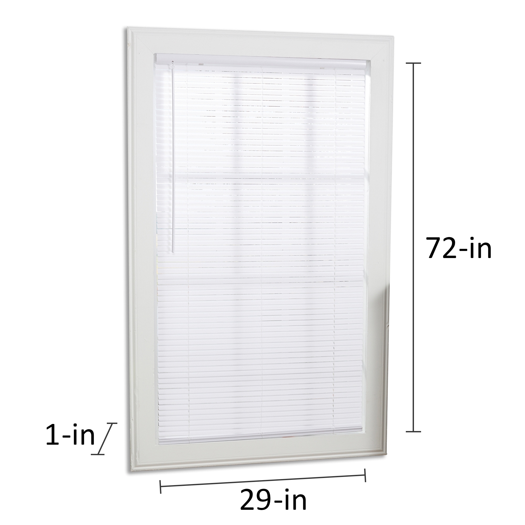 These 1-in vinyl blinds have a common dimension of 29-in W x 72-in H, while the actual dimension is 28.5-in W x 72-in H to provide window clearance
