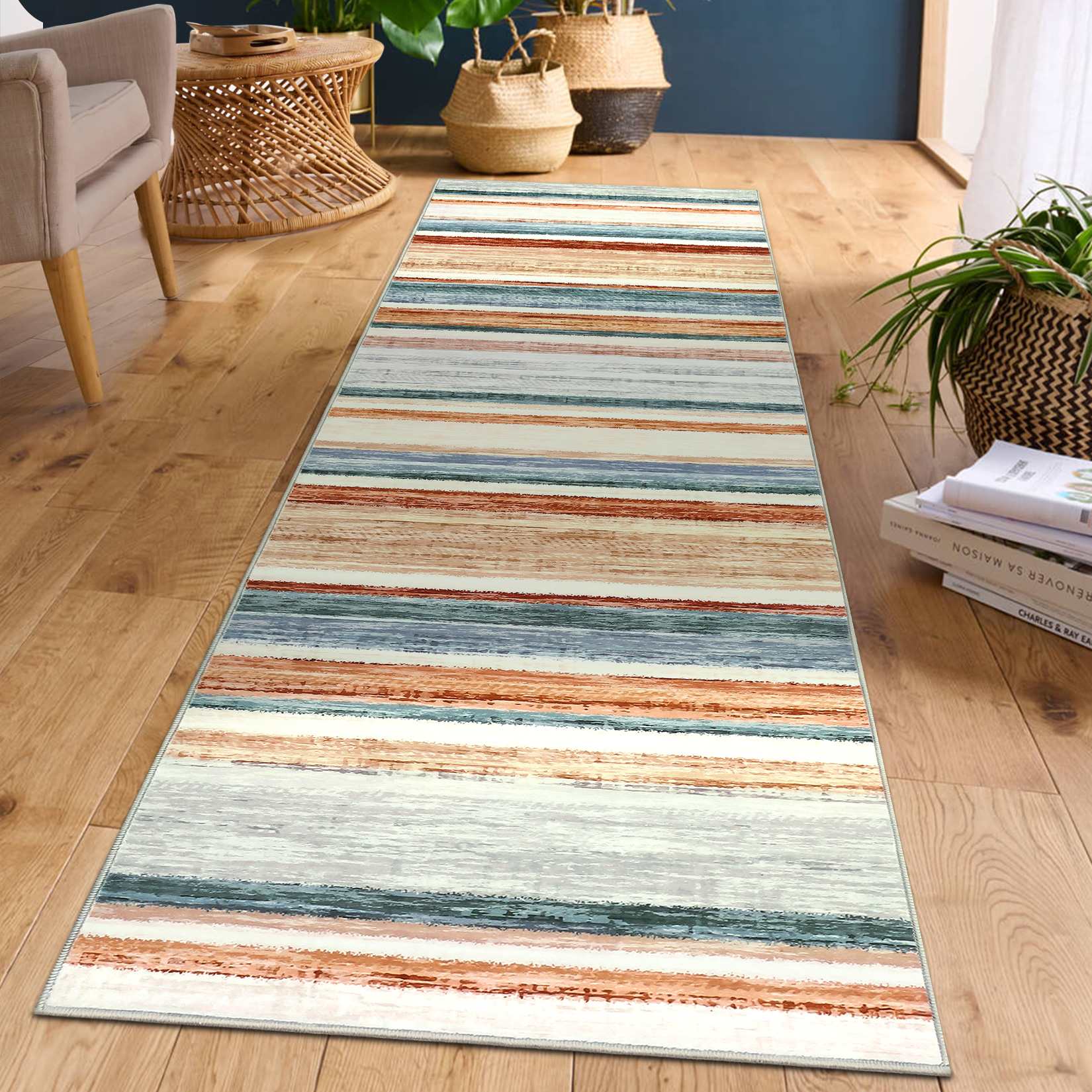 This washable area rug features a contemporary modern strip pattern, adding a touch of sophistication to any space and making it perfect for your kitchen, laundry room, or bedroom.