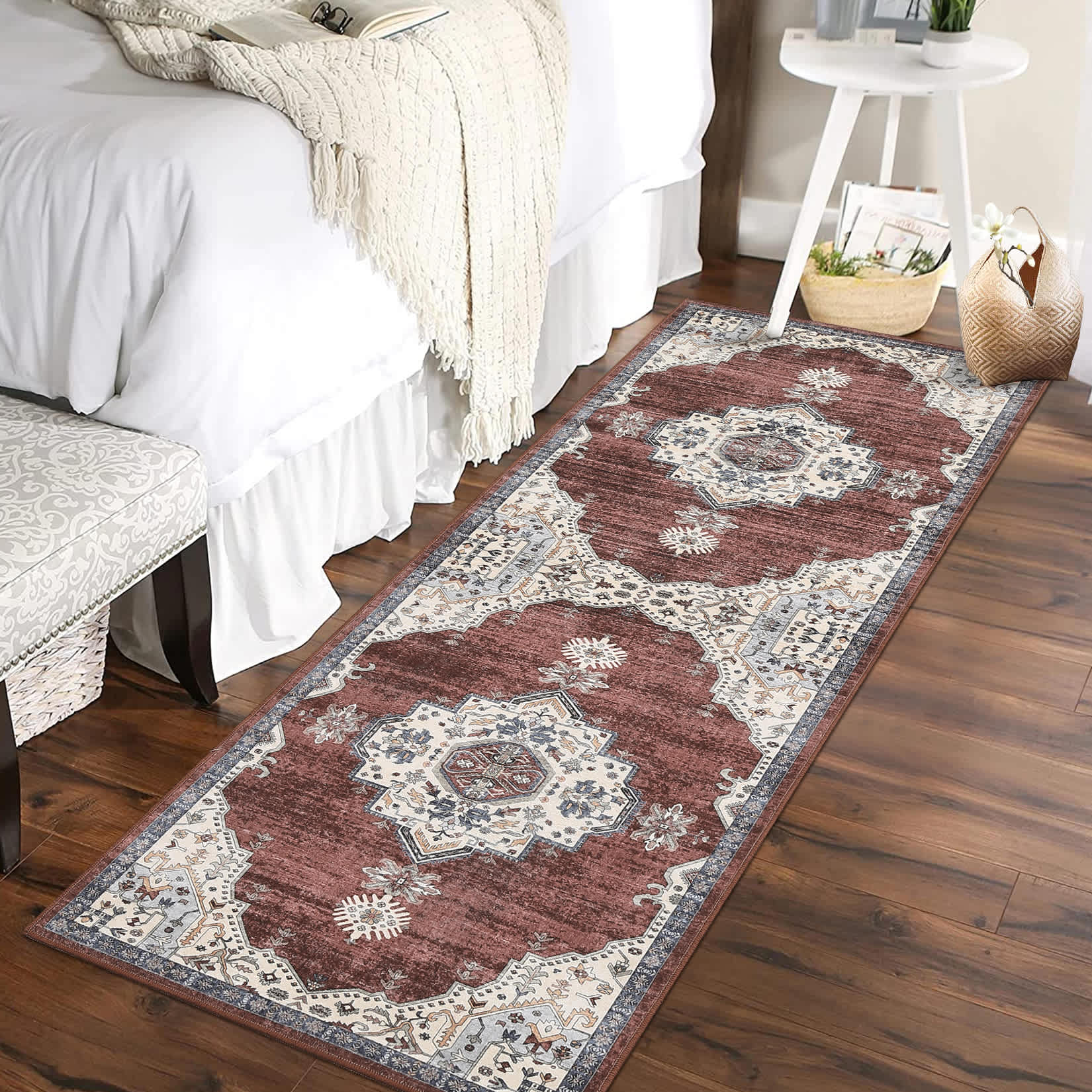Qeetex 2 x 6 ft Polyester Towel Pile Beige Red Rectangular Hallway Bathroom Entryway Kitchen Office Foldable Flower Printed Persian Washable Area Rug