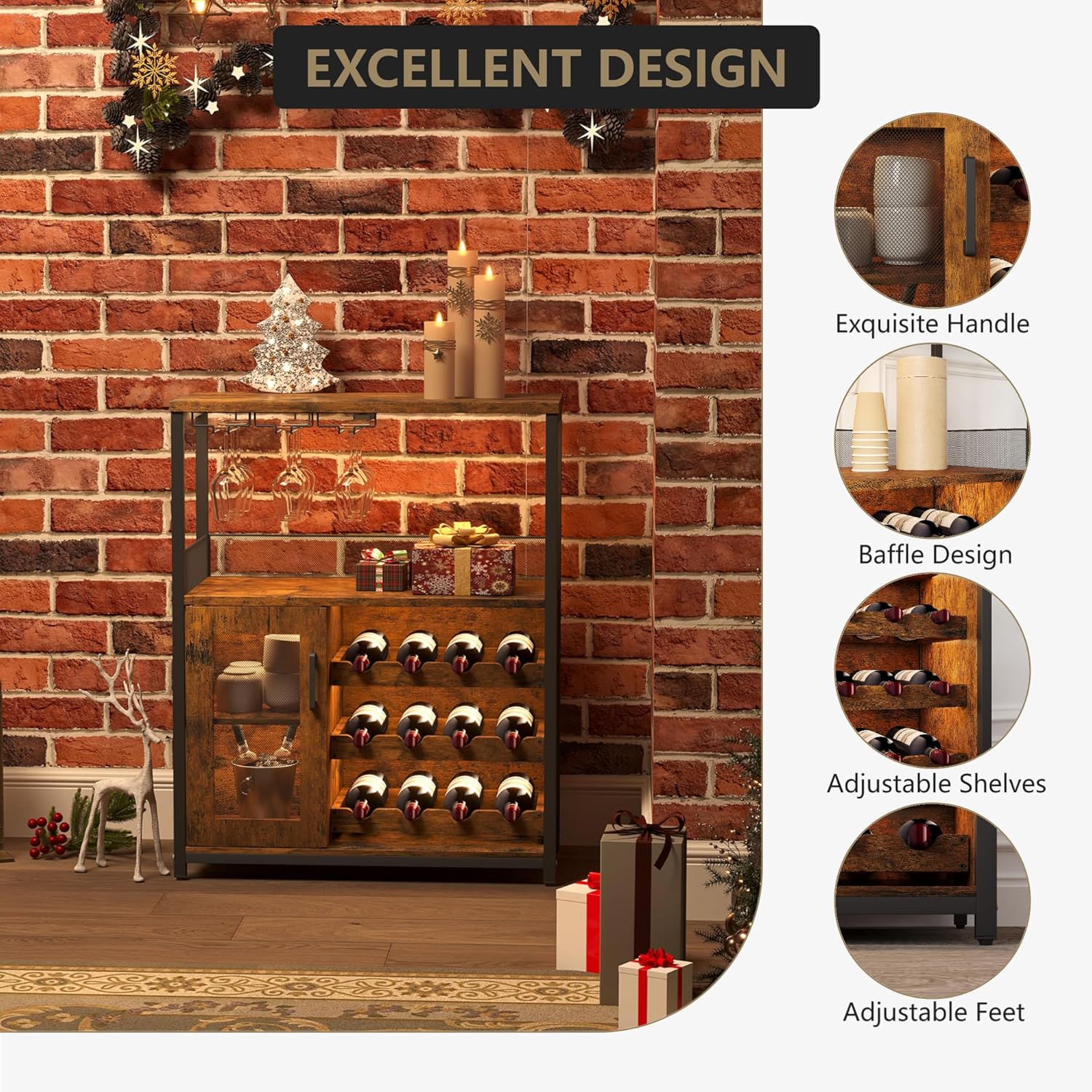 Qeetex 3-Tier Wine Bar Cabinet with Detachable Wine Rack and Storage Space Buffet Cabinet with Glass Holder and Mesh Door for Kitchen Living Room and Bar Rustic Brown