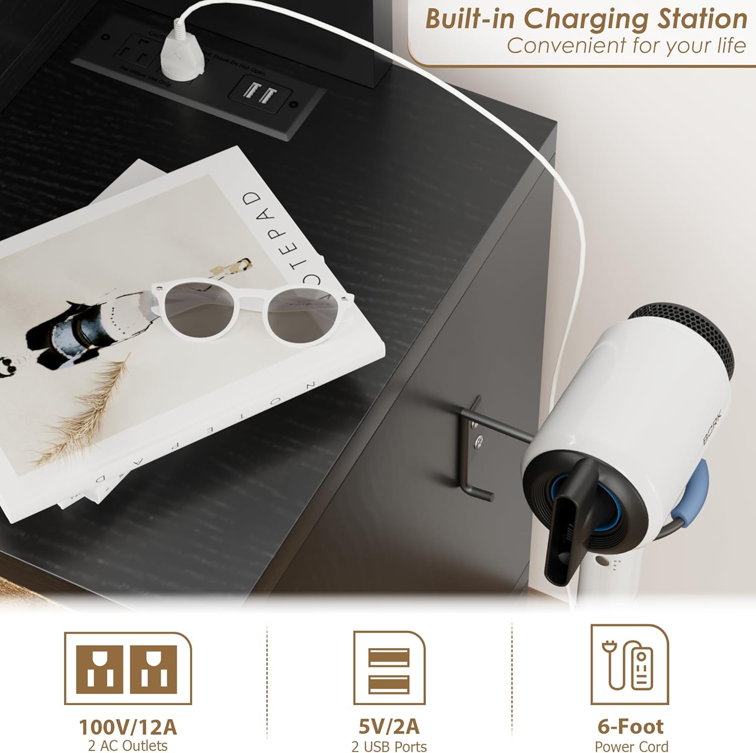 Qeetex 46.8IN Vanity Desk with Mirror - LED Lights and Power Outlet - Makeup Vanity Table with 5 Drawers and 3 Storage Shelves - Dressing Table with Black Handle for Bedroom/Dressing Room - Black