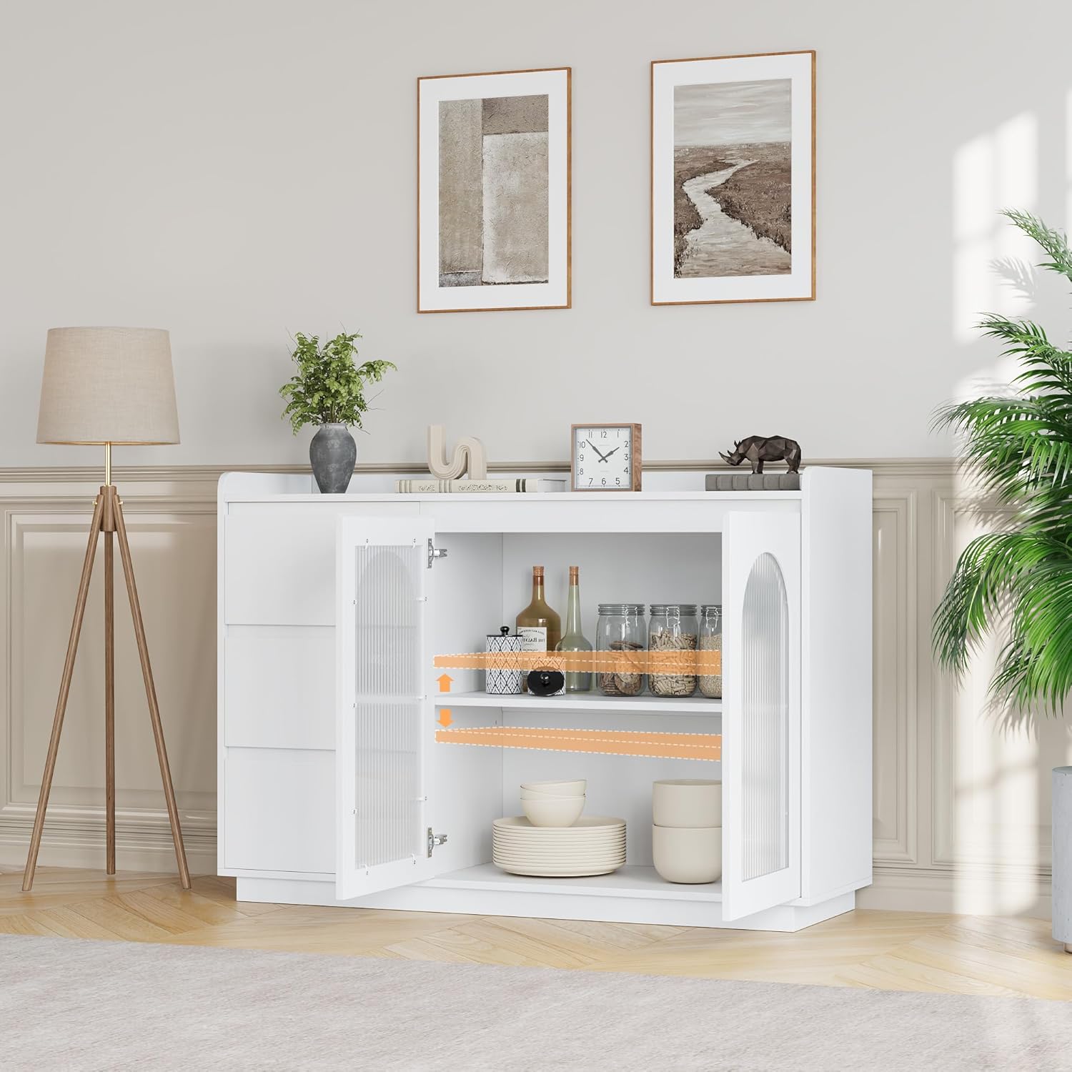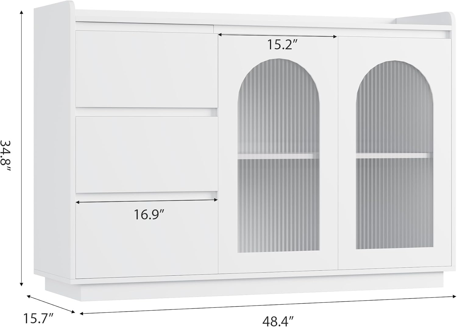 Qeetex 48 Inch White Sideboard Buffet Cabinet with Glass Doors Three Drawers Adjustable Shelves and LED Lights for Kitchen Dining and Living Room