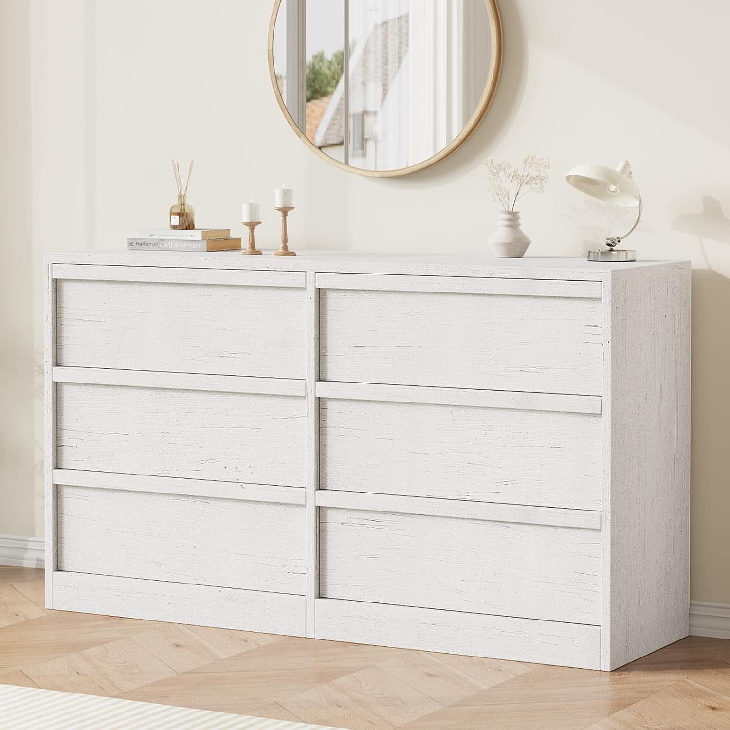 Qeetex 6 Drawer Dresser for Bedroom - Modern Double Dresser Organizer with 6 Drawers Large Storage - Wooden Chest of Drawers for Living Room/Nursery/Hallway - White