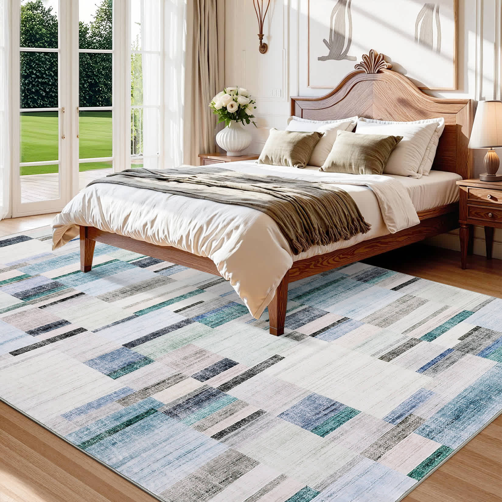 Qeetex 9 x 12 ft Polyester Blue Rectangular Living Room Bedroom Dining Room Geometric Patchwork Modern Farmhouse Machine Washable Area Rug