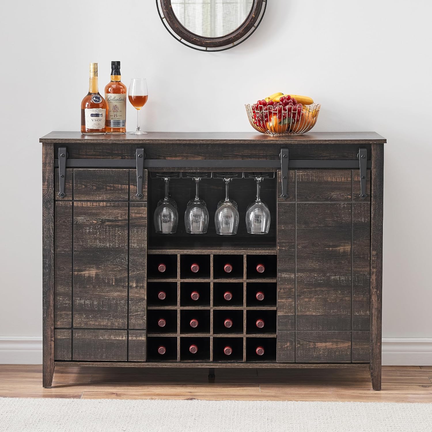 Qeetex Bar Cabinet 47 inch Buffet Server Sideboard with Sliding Barn Doors Farmhouse Storage Cabinet Cupboard Table with Adjustable Shelf for Kitchen Dining Room Dark Brown