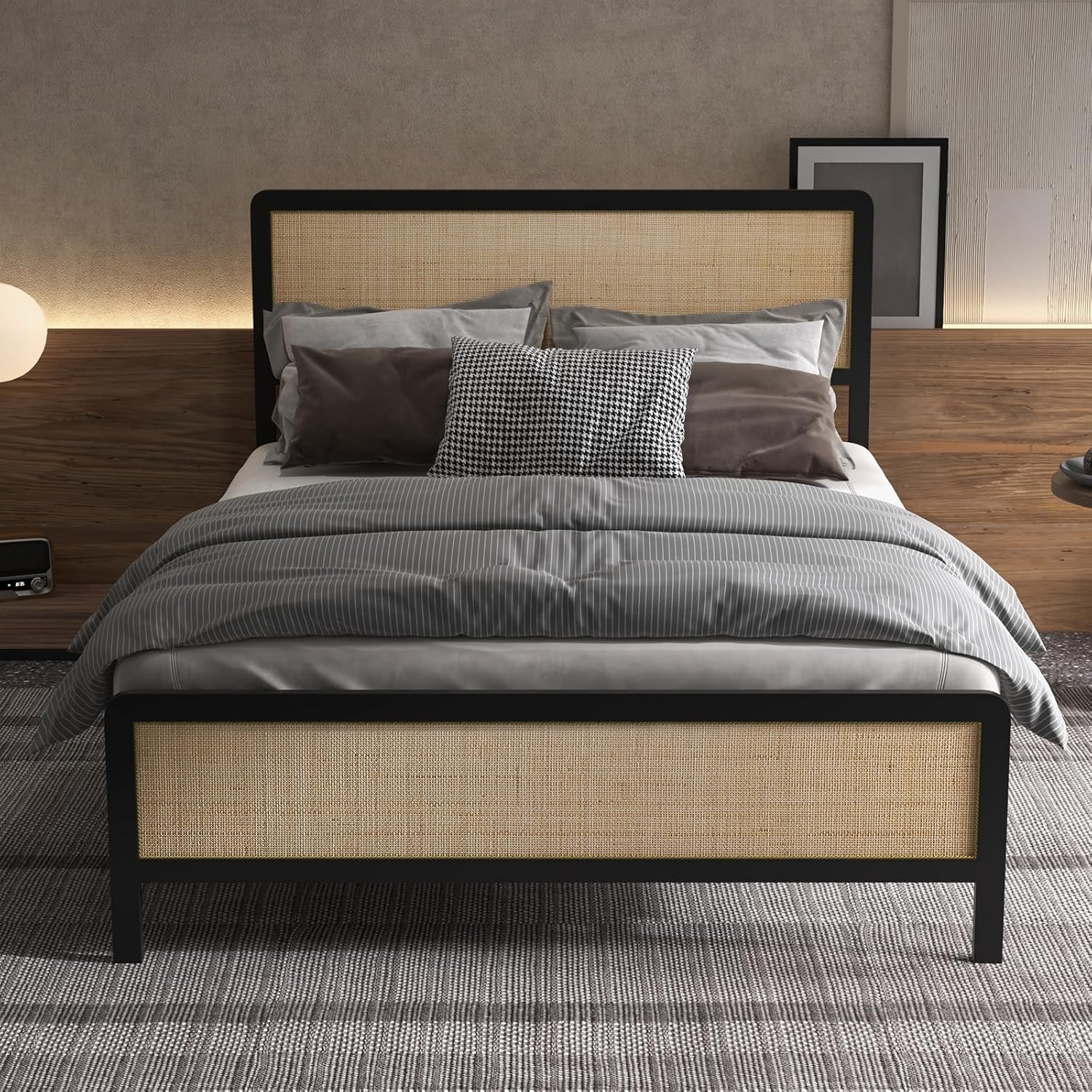Qeetex Bed frame with natural rattan headboard and footboard metal platform frame with underbed storage no box spring needed strong wood slat support rattan wood accent