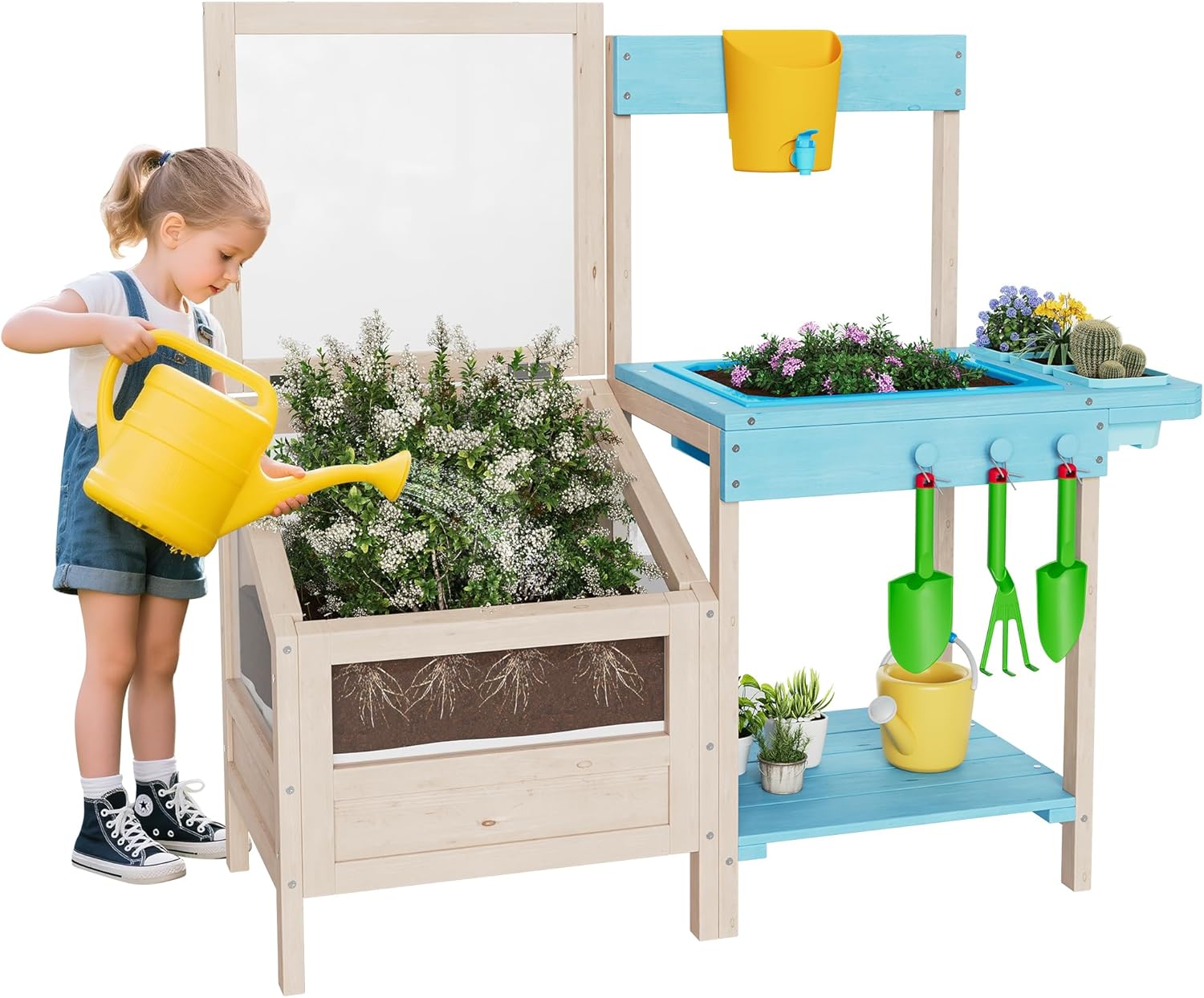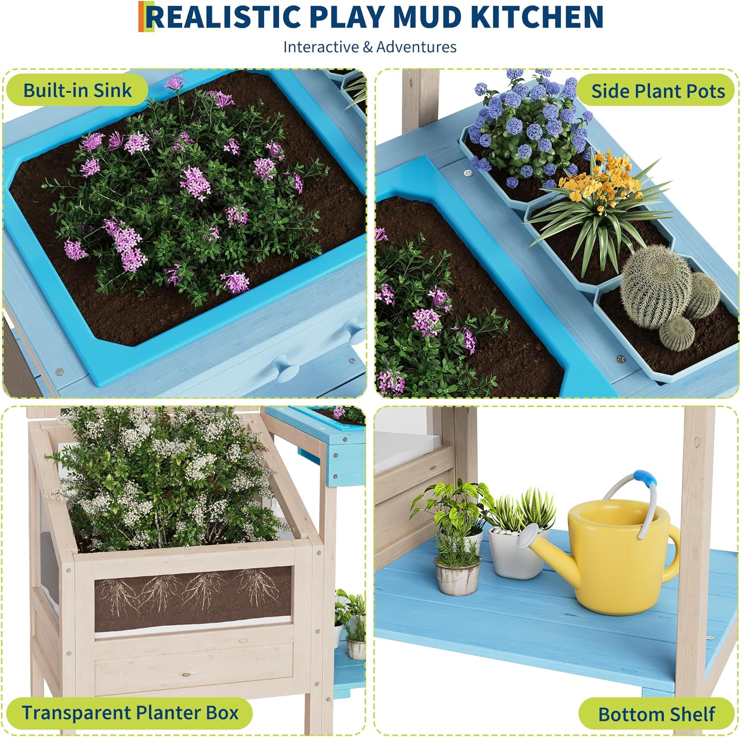 Qeetex Outdoor Wood Mud Kitchen for Kids Potting Bench with Garden Bed Transparent Planter Window Gardening Tool Set Removable Sink See Through Planter Box Storage