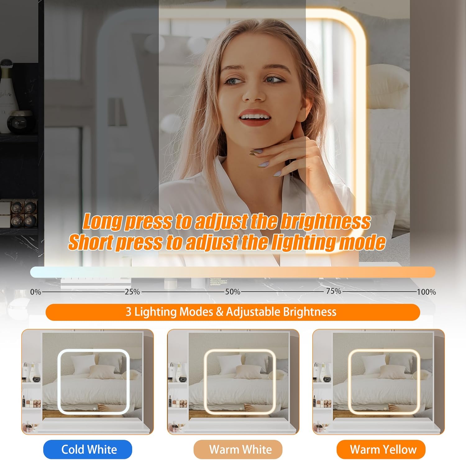 Qeetex Vanity Desk With Mirror and LED Lights - Makeup Vanity Desk With Sliding Mirror/Power Outlet - 3 Color Adjustable Light - Dressing Table With 4 Drawers - Storage Shelves and Stool for Bedroom - Marble Black