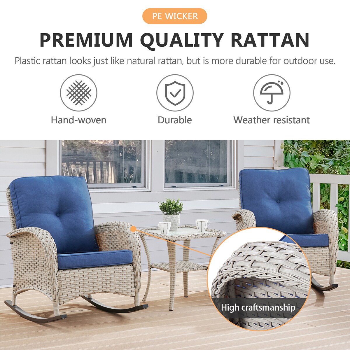 - This furniture is made of PE Wicker, a durable and beautiful material.