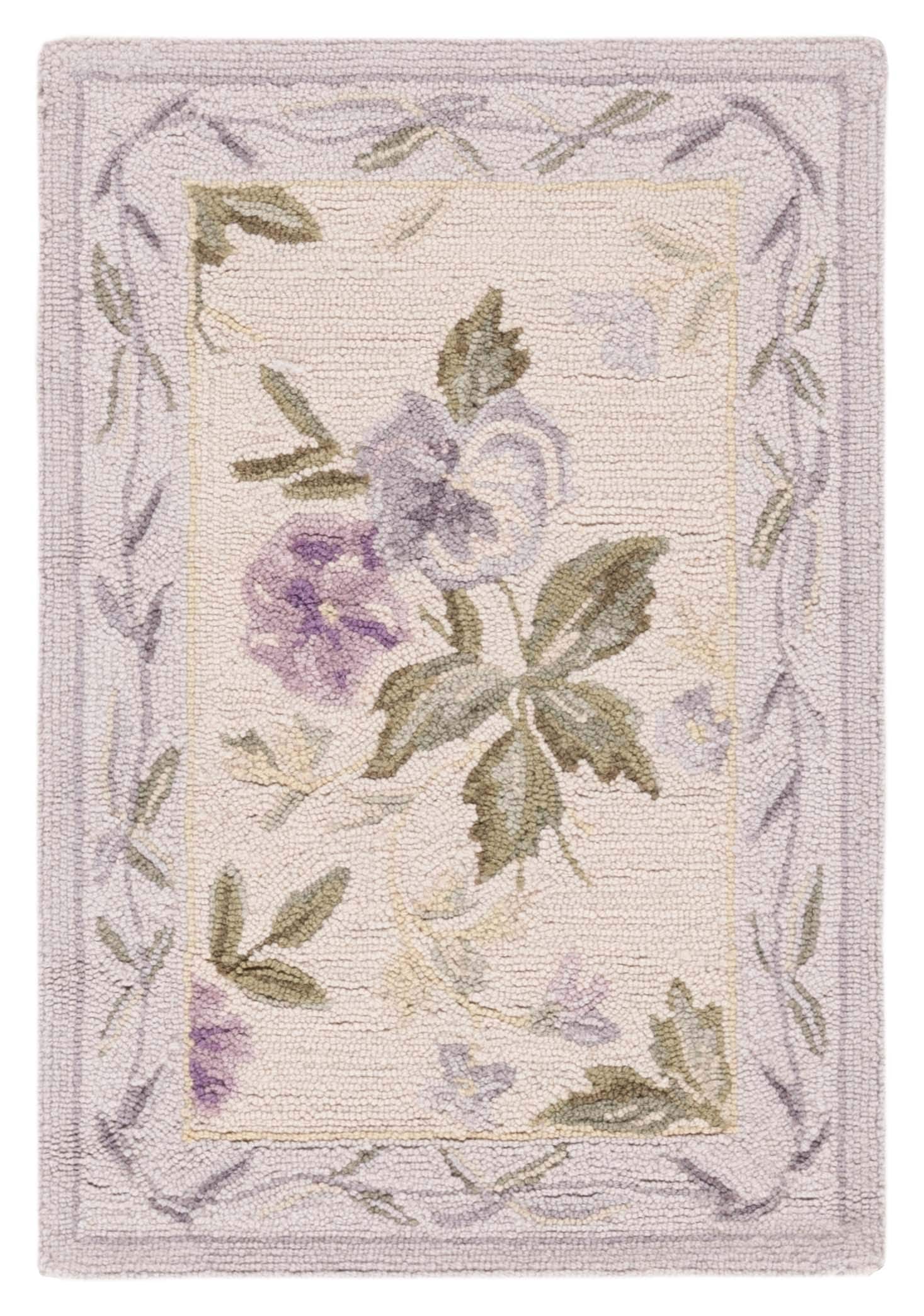 With a wool pile construction, the rug delivers warmth and comfort underfoot, while its ivory backdrop serves as a canvas to the enchanting floral pattern. The delicate hues of purple and green florals, intertwined with soft leafy accents, are reminiscent of a serene garden, bringing nature's tranquility into your home.