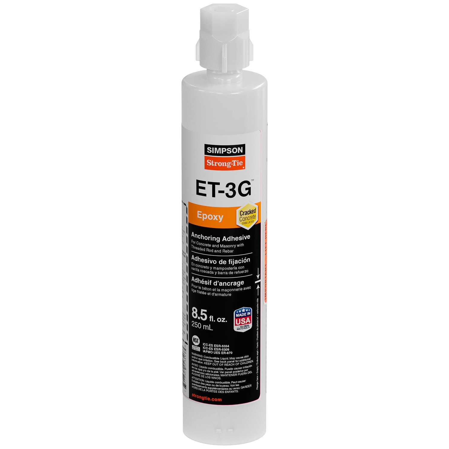 ET-3G is a two-component, high-solids, epoxy-based system ideal for general anchoring of threaded rod and rebar into concrete (cracked and uncracked) and masonry (cracked and uncracked). ET-3G has a long working time — 50 min at 70°F (21°C) , and can be applied in dry or damp conditions. The adhesive is a teal color when mixed properly and has a substrate installation temperature range from 50°F (10°C) to 110°F (43°C). Simpson Strong-Tie® epoxy anchors for concrete and masonry are rigorously tested to meet IBC requirements, including for both cracked and uncracked concrete applications.