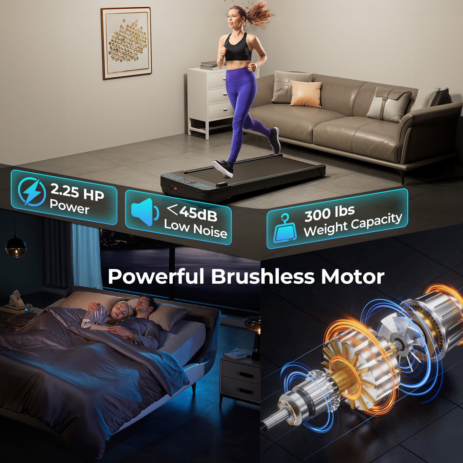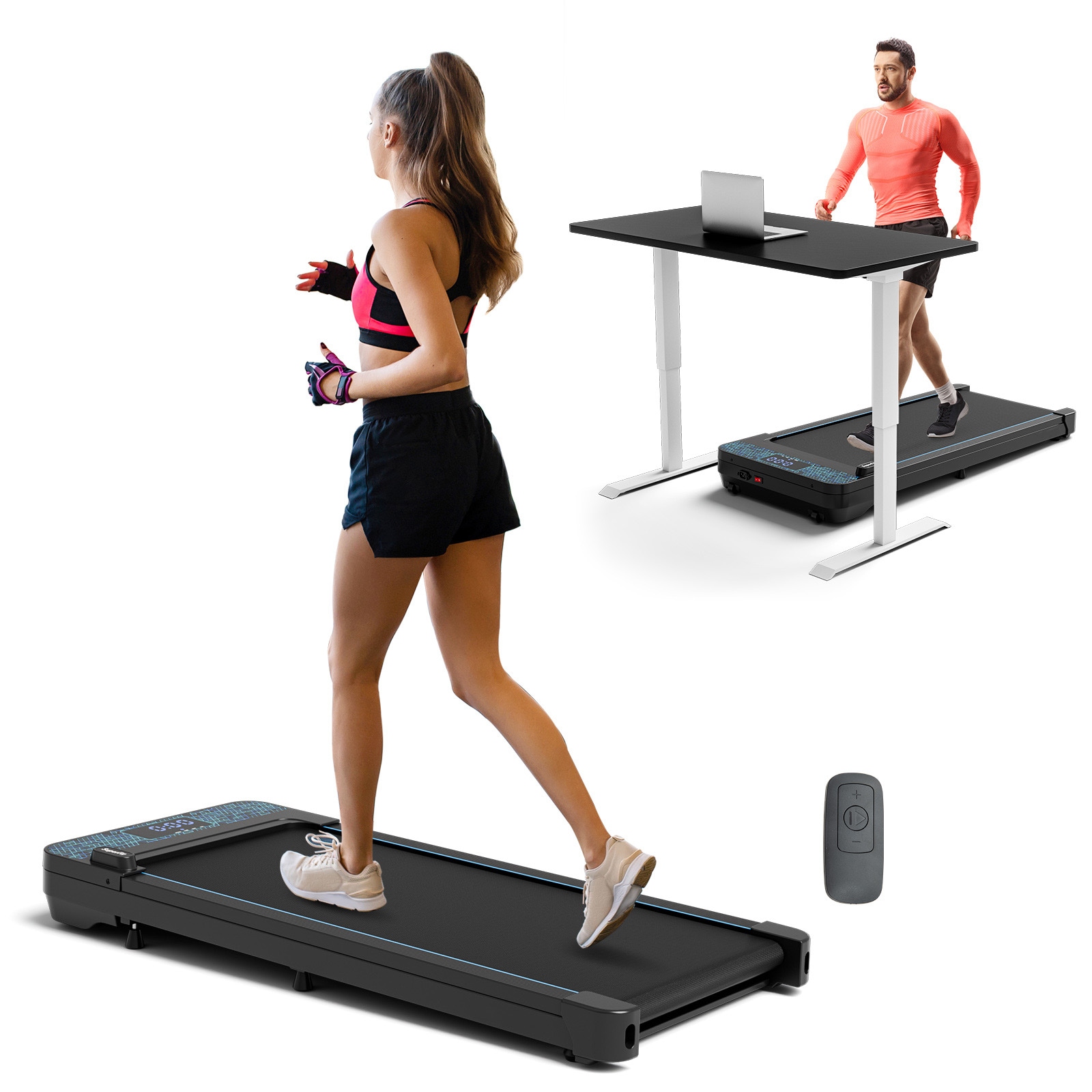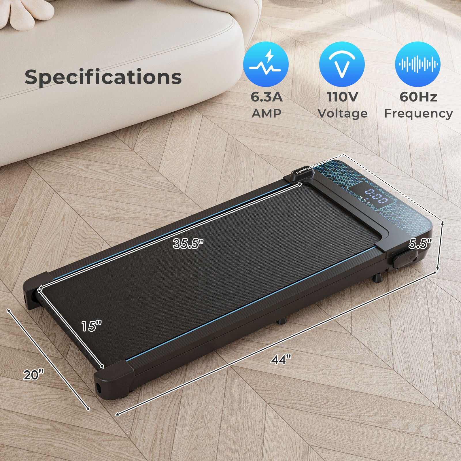 Stay active at home or in the office with this Incline Under Desk Walking Pad, designed for quiet, compact, and effective workouts. Its brushless motor supports up to 300 lbs while operating under 45 dB, allowing you to walk or jog without disturbing your environment. Adjust speeds from 0.6 to 3.8 MPH, and take advantage of the slight incline platform to increase calorie burn and challenge your core and leg muscles. The 7-layer diamond-textured running belt paired with six shock-absorbing rubber pads reduces impact on joints, providing a comfortable and safe stride. Track your progress easily with the LED display showing speed, time, distance, and calories, and control your session using the included remote. The walking pad also connects to a smart app for interactive workouts and progress monitoring. Fully assembled and featuring two transport wheels, this treadmill is easy to move and store, with a compact 5.4" height ideal for under desks or furniture.