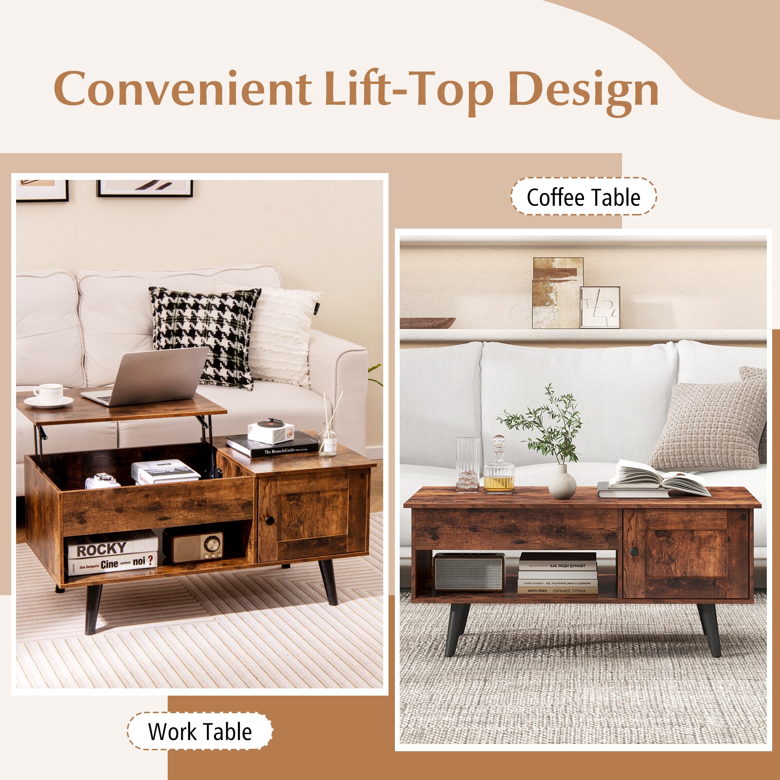 Slickblue Rustic Brown/Black/Natural Engineered Wood Coffee Table with MDF Frame Lift Top Hidden Compartment Shelf and Cabinet Living Room