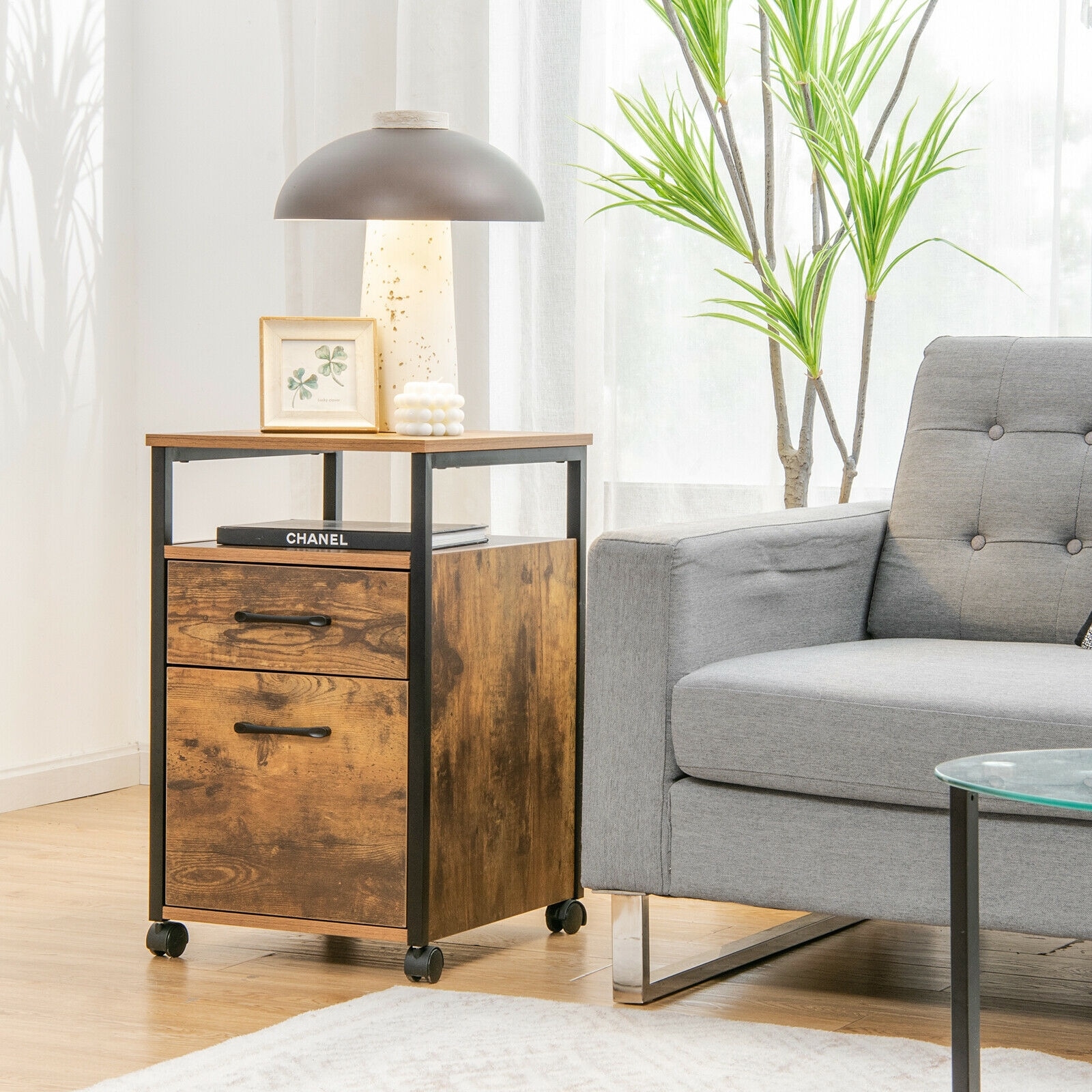 Keep your workspace organized with this 2-Drawer Rolling File Cabinet, combining practical storage with a compact design that fits under most desks. The spacious top surface holds printers, décor, or office essentials, while the open shelf keeps frequently used items within reach. The top drawer is perfect for smaller office supplies, and the lower file drawer includes a hanging bar for letter-size file folders, helping you stay tidy and efficient. Built with a sleek industrial-inspired frame and smooth engineered wood panels, this file cabinet balances style and function. Four smooth-rolling casters allow you to move it anywhere, and two locking wheels keep it securely in place when needed. Its versatile size works perfectly in home offices, living rooms, or studies, whether you’re organizing documents, storing craft supplies, or setting up a compact printer station. Assembly is straightforward with the included illustrated manual, and the smooth surface wipes clean easily to maintain a neat workspace.