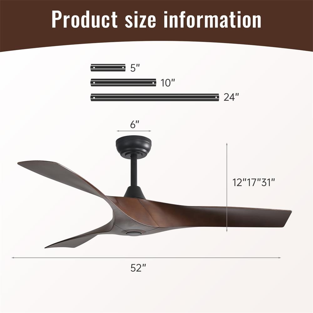 Elevate your space with this 52-inch 3-blade fan, designed to blend versatility and convenience seamlessly. It comes with three downrod lengths (5/10/24 inches), ensuring a perfect fit for any ceiling height—whether low and cozy or high and spacious. Operated effortlessly via remote, it offers six adjustable wind speeds, letting you switch from a gentle breeze for relaxed evenings to a powerful airflow for quick cooling. Its reversible motor is a year-round asset: in summer, it drives refreshing downdrafts, while in winter, it circulates trapped warm air to keep rooms evenly heated. Plus, the 1H/4H/8H timer lets you set auto-shutoff, saving energy whether you’re sleeping, napping, or stepping out—practicality meets adaptability for every home.
