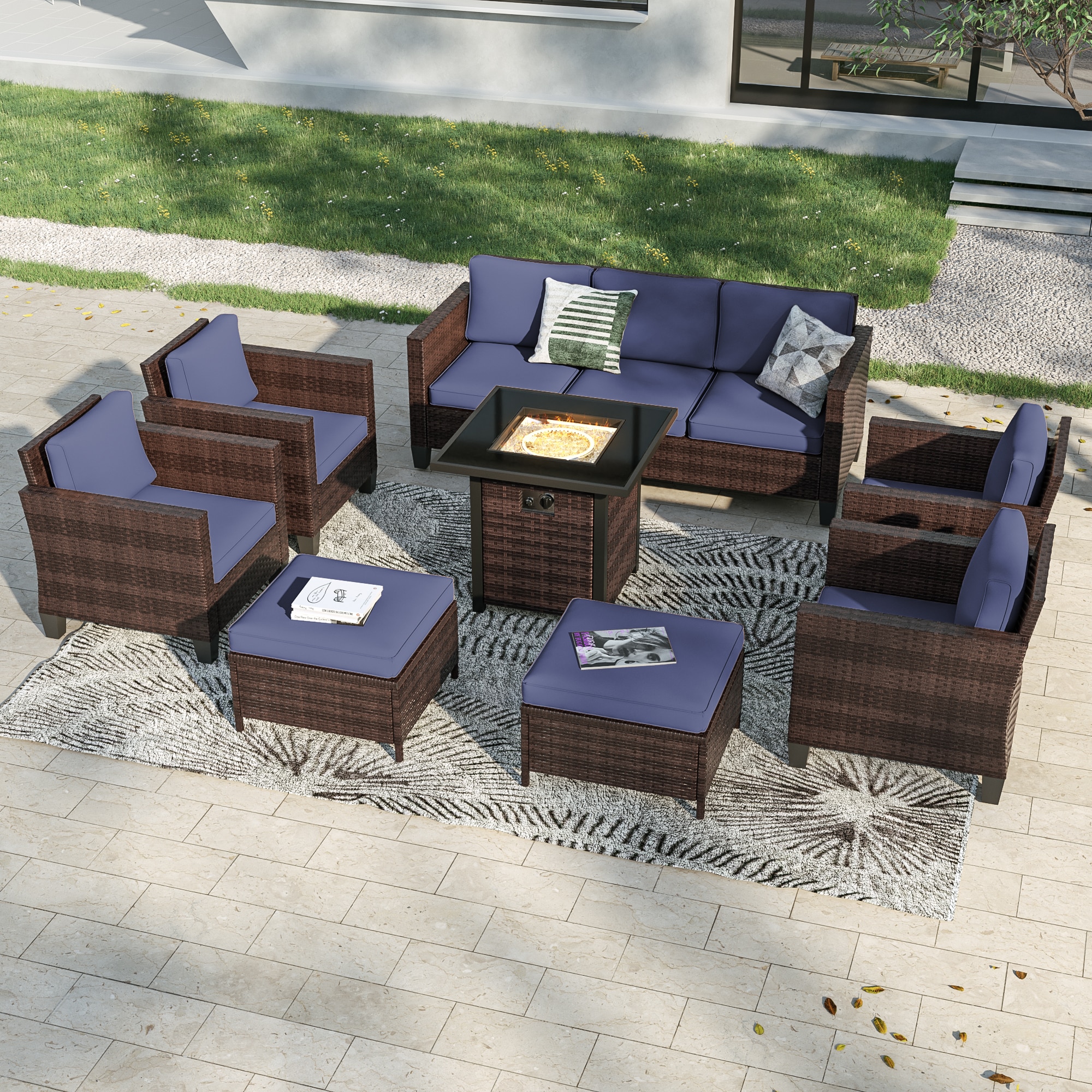 Sonkuki Patio Conversation Set 8 -Piece Wicker Patio Sofa Conversation Set with Navy Cushions