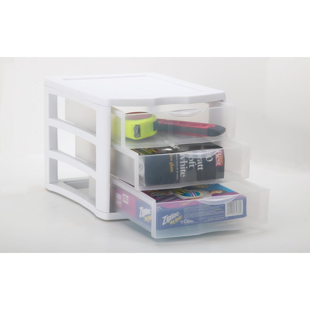 Discover the ultimate storage solution with the Sterilite 3 Drawer Clear Organizer, model 17918004. This versatile organizer features three spacious drawers, each measuring 13.38" x 11.50" x 9.63", perfect for storing standard-sized papers, craft supplies, cosmetics, and more. The clear drawers allow you to see the contents at a glance, making it easy to find what you need quickly. Designed with a durable white frame, this organizer not only adds a touch of elegance to your space but also ensures secure storage with its tight-fitting lid. Made in the USA from high-quality plastic, it combines classic styling with generous volume capacity. Ideal for both home and office use, the Sterilite 3 Drawer Clear Organizer is a must-have for anyone looking to declutter and organize efficiently. With a weight capacity of 2.5 pounds per drawer, this organizer is both functional and stylish. Upgrade your storage today!