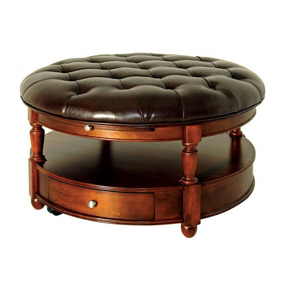 On round feet the bottom offers pull out drawers with slide out table trays and is open in the center with leather like tufted top
