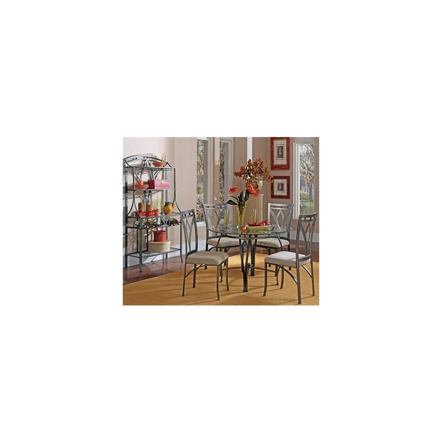 Baker's rack provides wine bottle and glass storage, as well as shelves for display