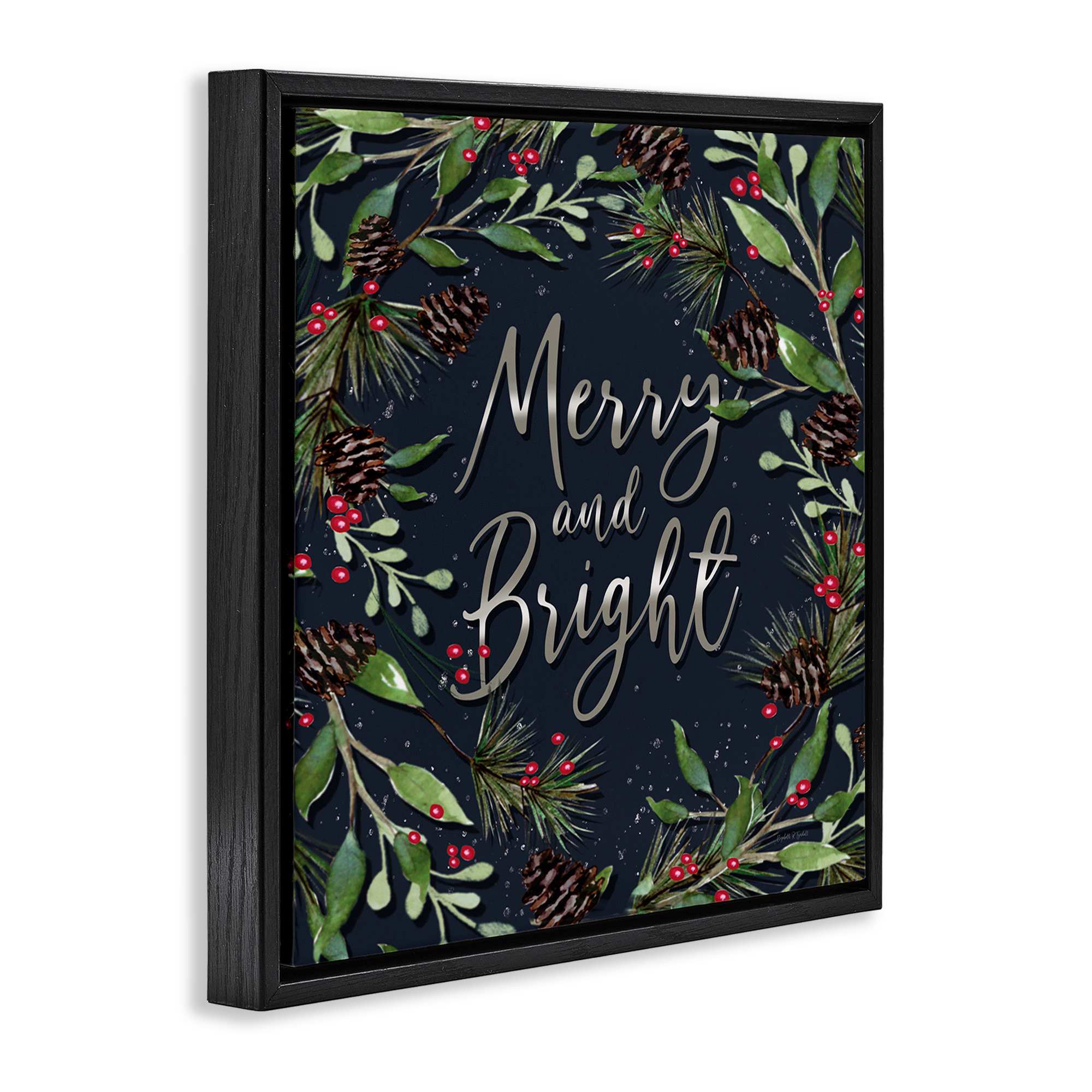 Stupell Industries Merry and Bright with Holly Leaves Black Framed Floater Canvas Wall Art By Elizabeth Tyndall 25 x 25