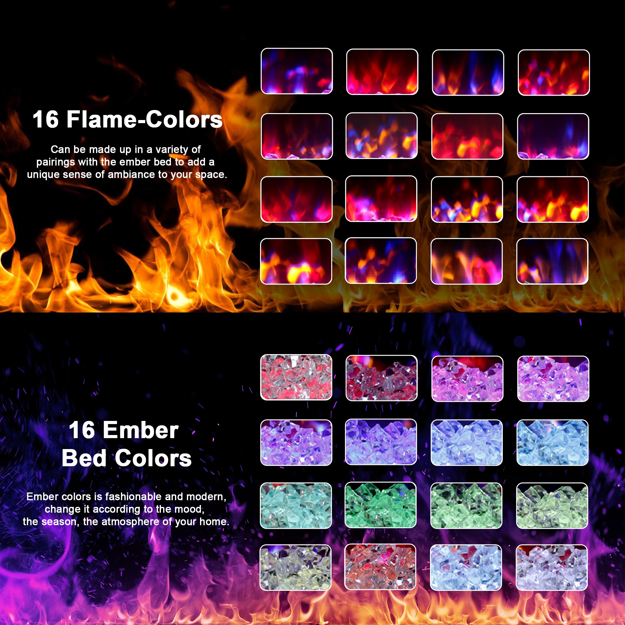 Realistic Flames: 16 flame and firebed colors, 5 brightness and speed settings, adjustable to your preference.