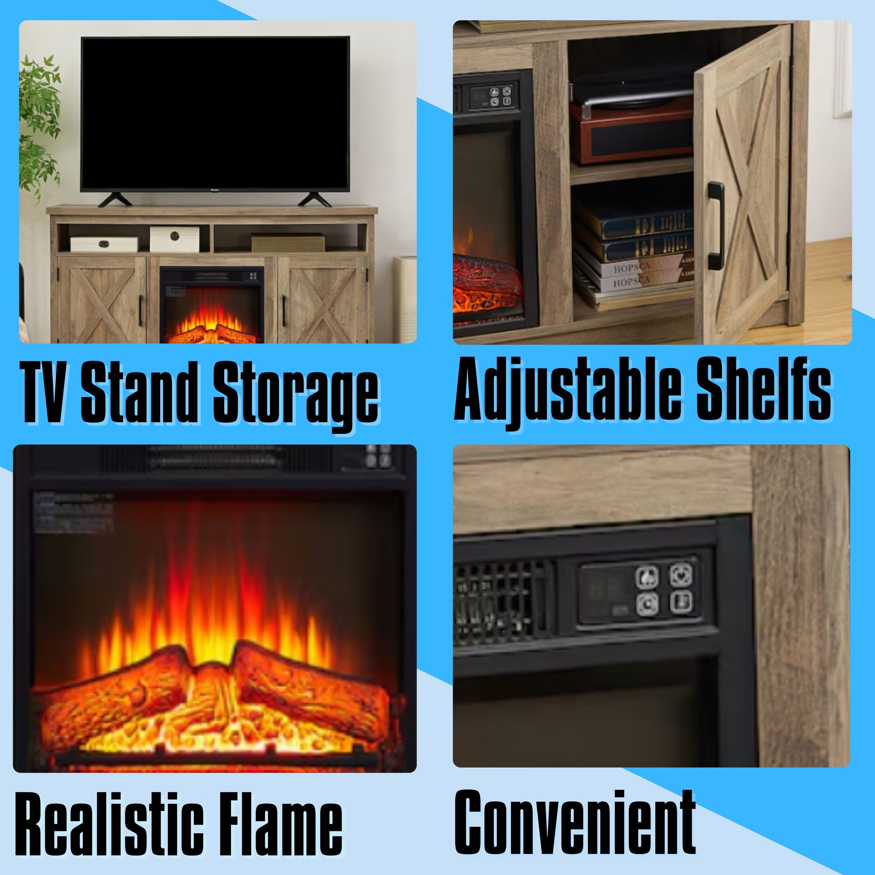 Bring the charm of rustic farmhouse style to your living room with this spacious 58" Farmhouse TV Media Stand featuring an 18" Electric Fireplace Insert. Designed to hold TVs up to 65", it offers plenty of space for your entertainment essentials, with open shelves for easy access and closed cabinets for hidden storage. The realistic electric fireplace creates a cozy, warm ambiance, and you can enjoy the flames with or without heat at the push of a button. The classic barn-inspired design, with textured finishes and antique metal hardware, adds a timeless, country-inspired touch to your home. Plus, the built-in cable management system keeps wires tidy, while adjustable shelves offer flexible storage options.