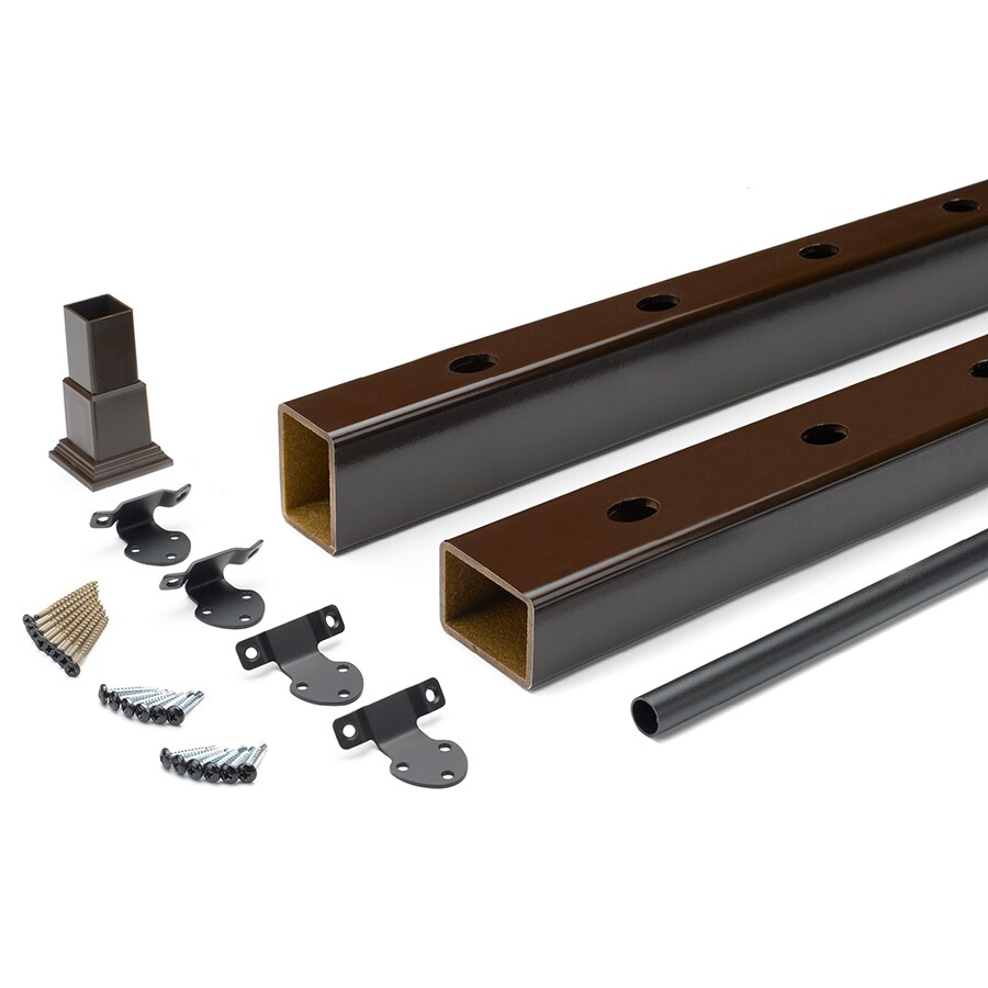 Kit includes 1 top and 1 bottom rail in Vintage Lantern, round aluminum balusters in Charcoal Black, 1 adjustable foot block and all necessary accessory hardware for a stair rail section