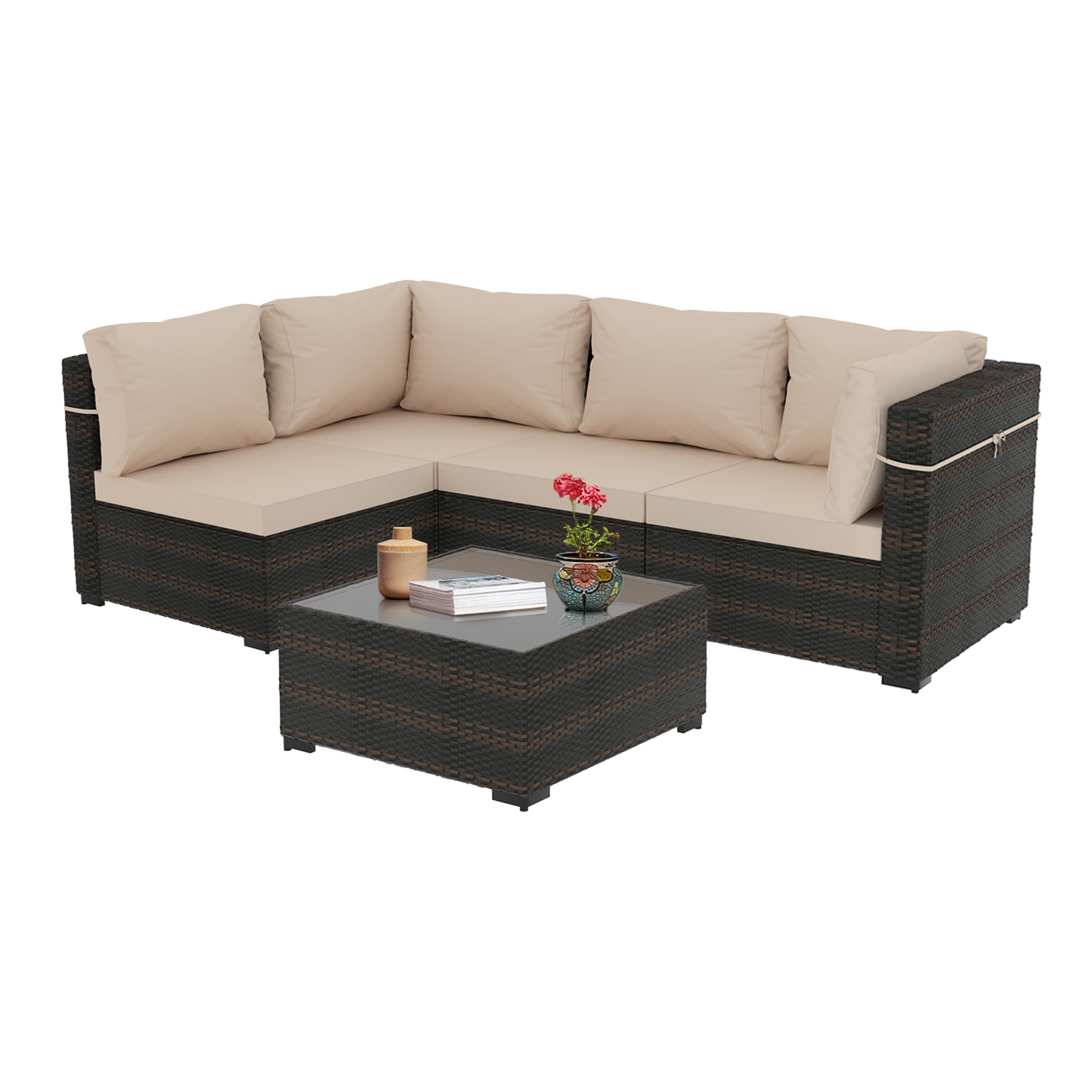 5-piece outdoor sectional patio set includes 2 corner sofas, 2 armless sofas and 1 coffee table; provides comfortable seating for up to 4 people