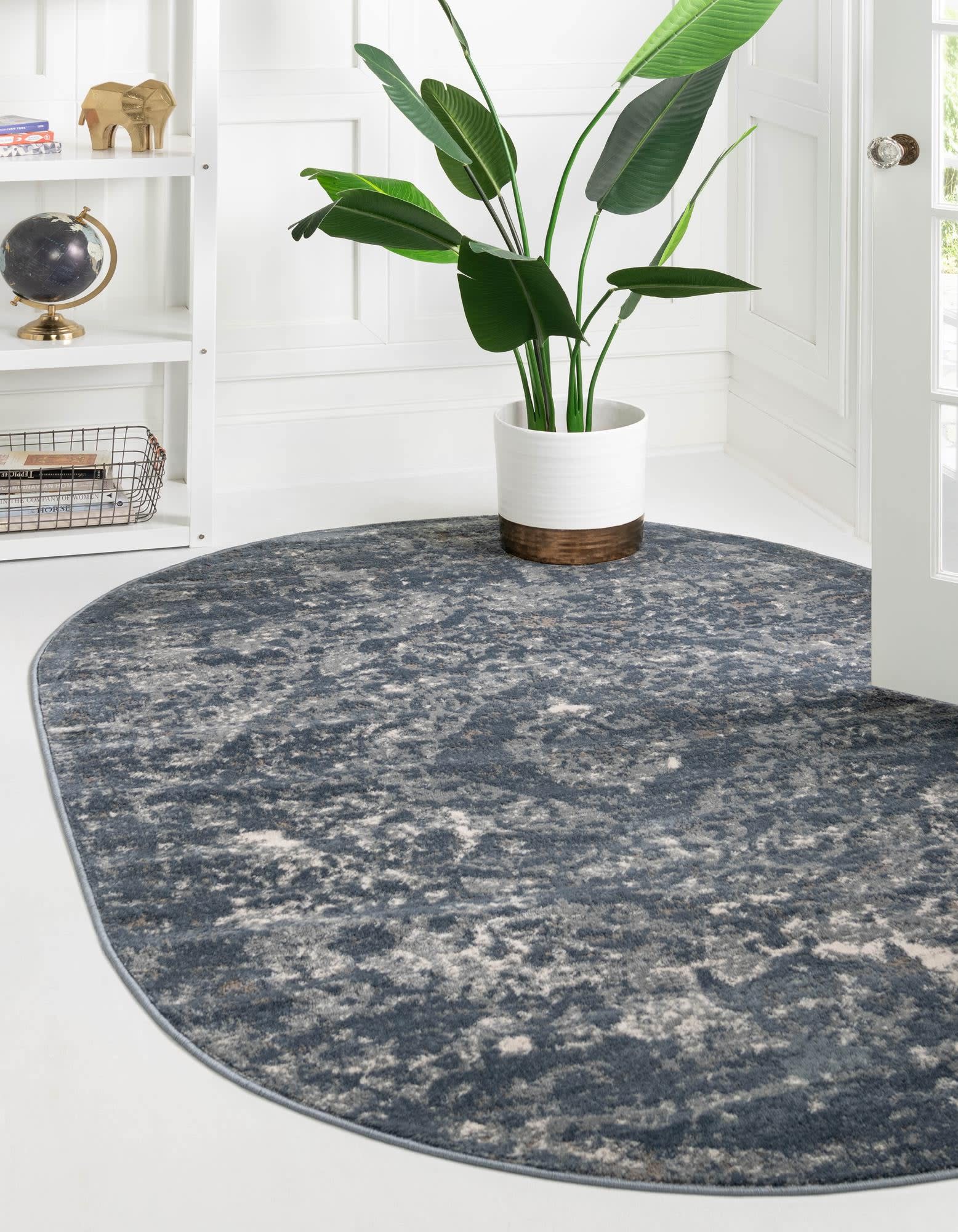 Size in FT: 5' 3" x 8' Oval - Size in CM: 160 x 244 - Pile Height & Thickness: 1/3" - Colors: Blue, Ivory, Gray