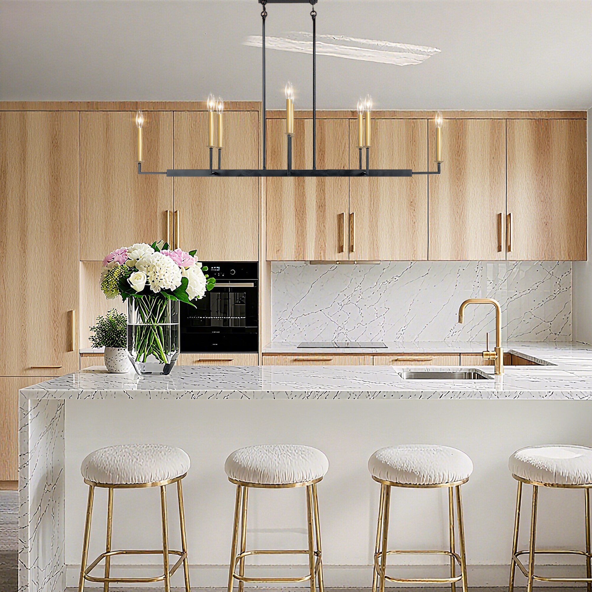 The Uolfin Lighting 8-Light Farmhouse Modern Chandelier, a striking blend of dark gold texture and black accents that embodies a rustic mid-century aesthetic. This chandelier, featured on lowes.com, exemplifies the transitional style with its elegant candlestick design. The dining room fixture showcases a graceful curvature and elongated tubular arms, providing a fluid and contemporary appeal to its minimalist silhouette. Crafted for contemporary elegance, the aged gold finish highlights subtle details that capture attention, while the rustic metal body supports eight branches that elegantly form candle-shaped lamp holders. Designed for versatility, the chandelier's arms can be adjusted to your preferred angle, allowing for personalized lighting. The antique gold and black finish reflects refined taste, making this piece a perfect addition to any space. Whether enhancing the ambiance of your bedroom, kitchen, living room, dining room, stairwell, entrance hall, or guest room, this vintage chandelier effortlessly elevates your decor.