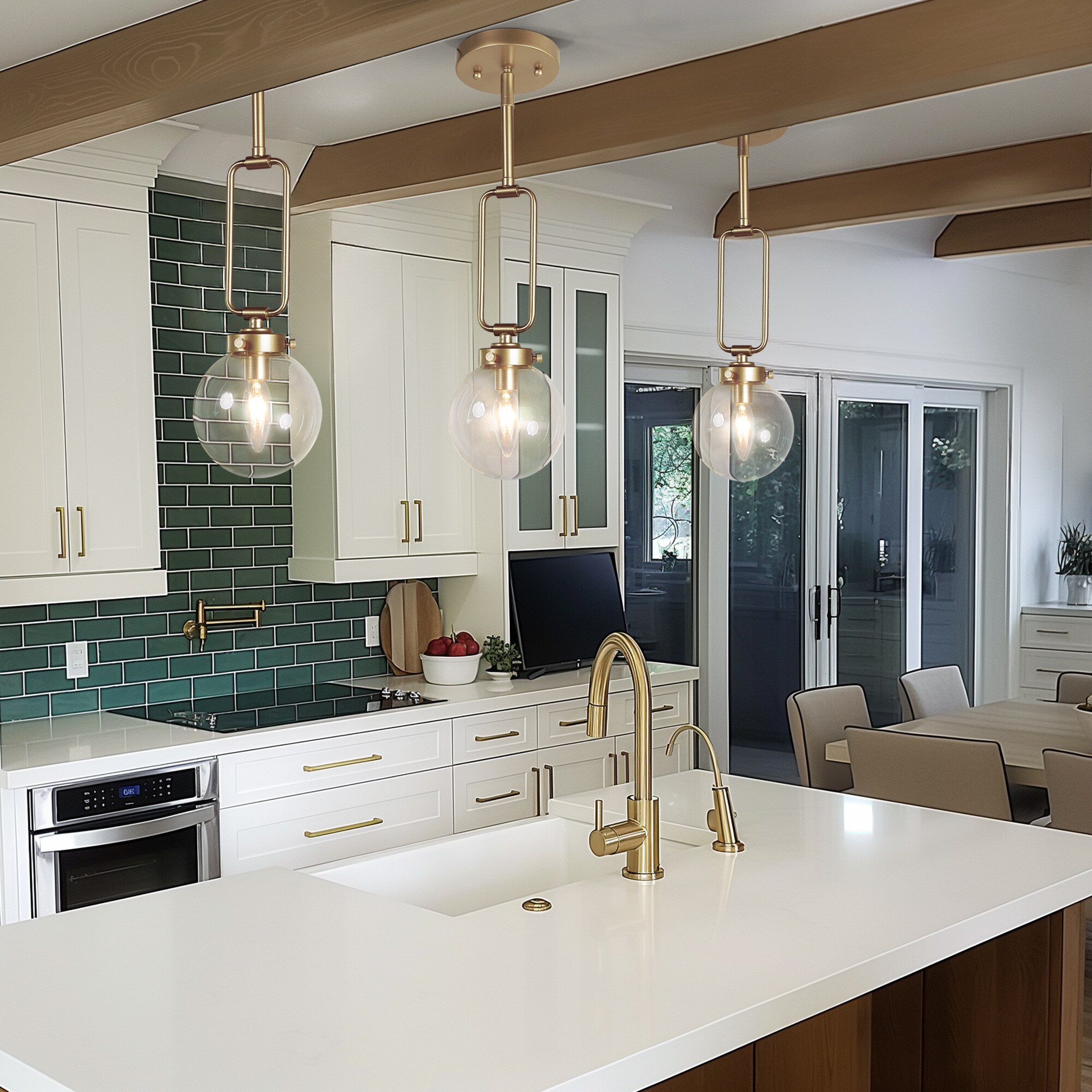 Minimalist satin gold glass pendant for kitchen island is transitional modern