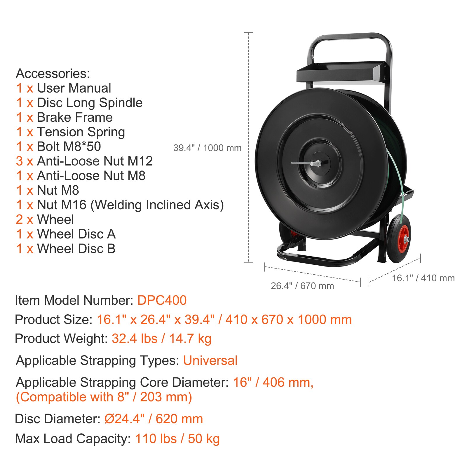 Specification: Item Model Number: DPC400; Product Size: 16.1" x 26.4" x 39.4"/410 x 670 x 1000 mm; Product Weight: 32.4 lbs/14.7 kg; Applicable Strapping Types: Universal; Applicable Strapping Core Diameter: 16"/406 mm, Compatible with 8"/203 mm; Disc Diameter: Ø24.4"/620 mm; Max Load Capacity: 110 lbs/50 kg