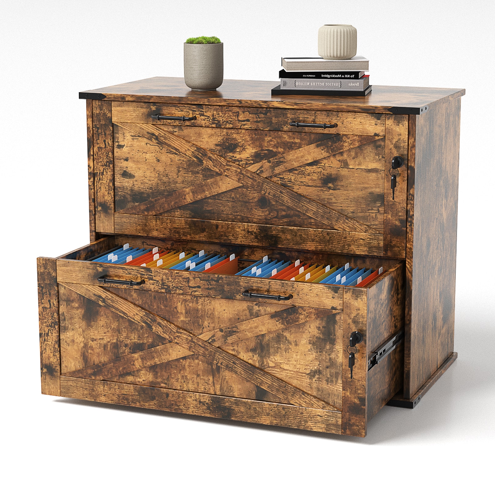 The 17.7W x 30.7H 2-Drawer File Cabinet with Lock is a secure and stylish storage piece designed for Letter, Legal, and A4 size file folder storage, ideal for home offices, studies, and living spaces. It features a charming farmhouse style with barn door elements and an eye-catching design that brings warm, rustic character to any environment. This cabinet offers smart storage solutions with 2 large drawers for hanging file folders and a top small drawer for office and study supplies, providing organized, partitioned storage in a space-saving size. Three-section slides allow the drawers to extend fully and smoothly in complete silence, ensuring easy and quiet access to your documents. The 2 large drawers can be locked independently for privacy, with 2 keys included for each lock for added security. Constructed from high-quality wood and fitted with an anti-tip kit, it delivers durable performance and improved safety for long-term use. It offers versatile functionality, suitable for hanging files or general storage when the rods are removed, and also works excellently as a printer stand. Detailed step-by-step instructions and clearly numbered accessories are included for easy assembly, with reliable customer support ready to assist within 24 hours for any installation issues. Finish: Rustic Brown