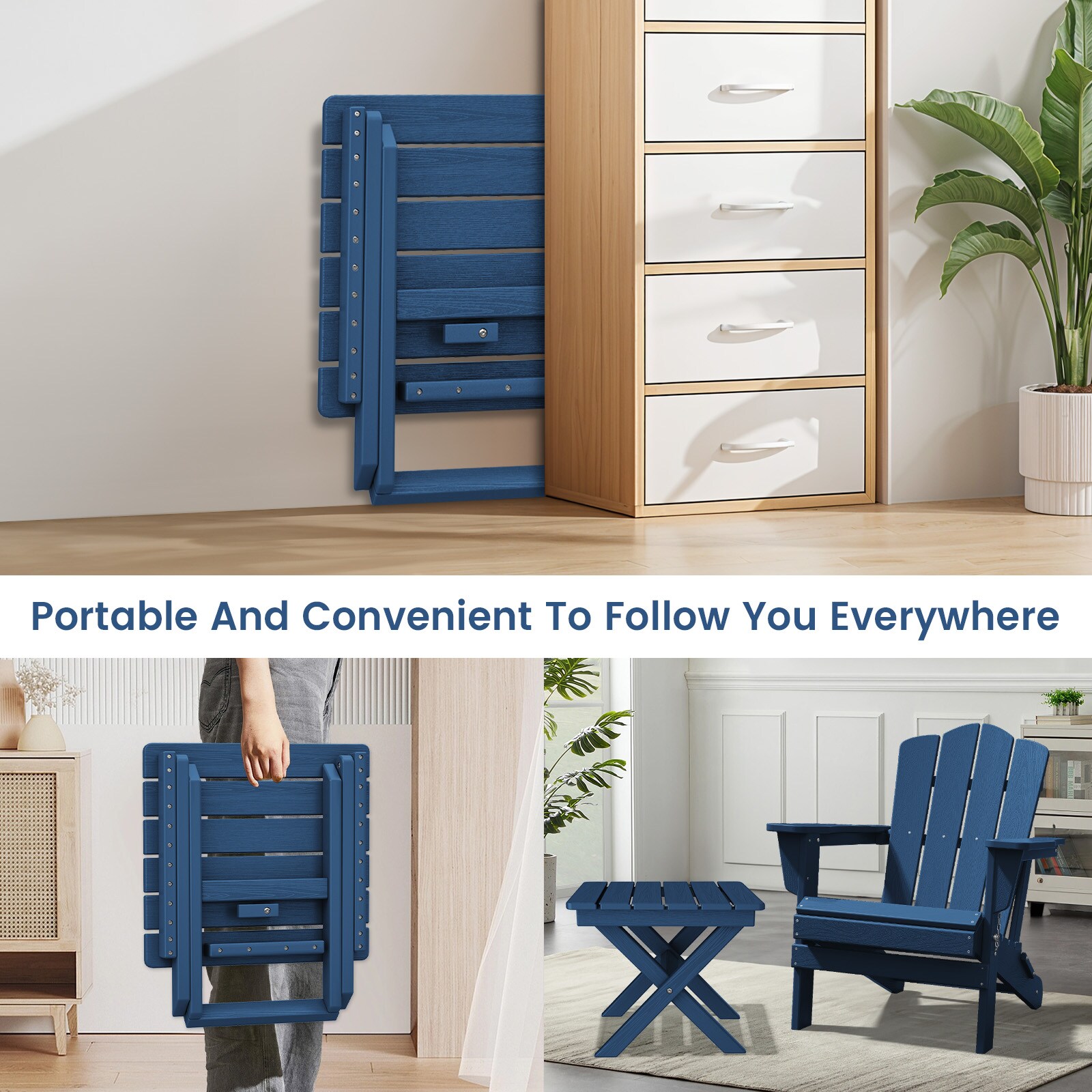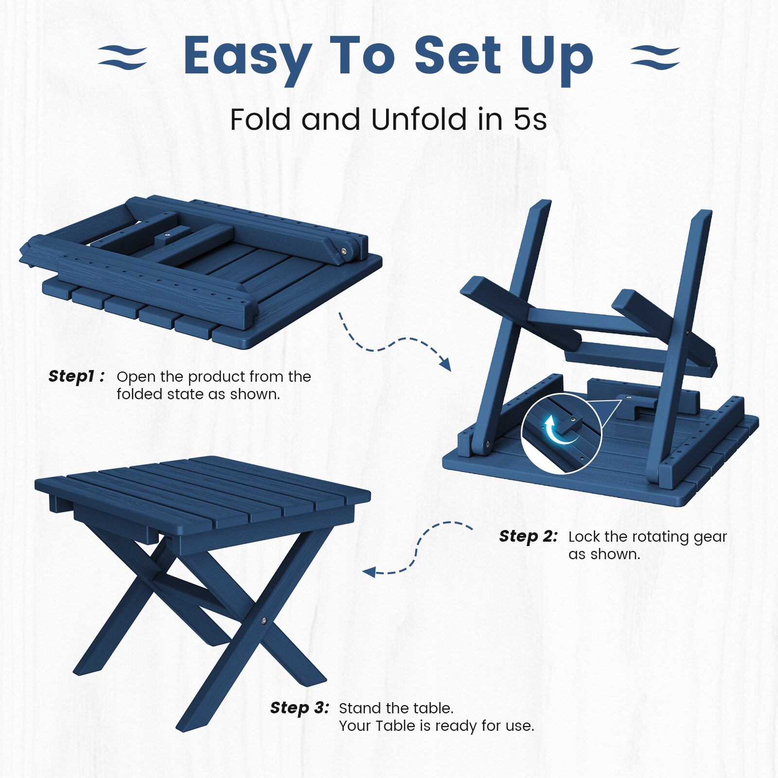 This HDPE folding side table is built for convenience and durability, featuring a quick-fold design that sets up or stores in seconds and folds compact for easy transport—perfect for patios, balconies, camping trips, or picnics. Made from all-weather HDPE with a wood-grain textured surface, it withstands sun, rain, and snow without cracking, fading, or peeling. Lightweight yet sturdy, it provides a reliable spot for drinks, snacks, or décor, whether you’re enjoying coffee on the porch, keeping essentials by the grill, or adding a lamp at your campsite, making it a versatile fit for any outdoor setting.
