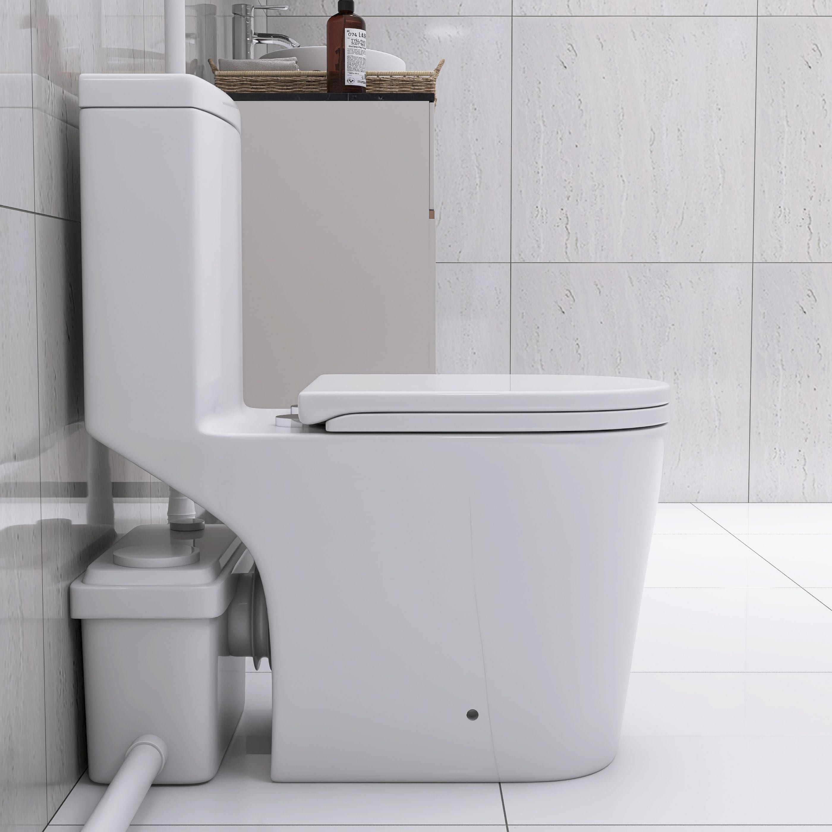 A simple up-flush toilet is the best choice for the basement, a loft/attic, an upper floor, a ground floor, and even a garage. The powerful 600-Watt macerator pump is designed with a dual flush system for plenty of power. Designed to effortlessly handle wastewater from toilets, sinks, showers, and more, this toilet ensures efficient waste disposal, even when the plumbing is below the main drainage line. The macerator pump is discreetly housed behind the toilet, maximizing your bathroom ins usable space. Its ADA-compliant height and soft-close seat provide comfort and convenience, while the modern design seamlessly blends into any setting.