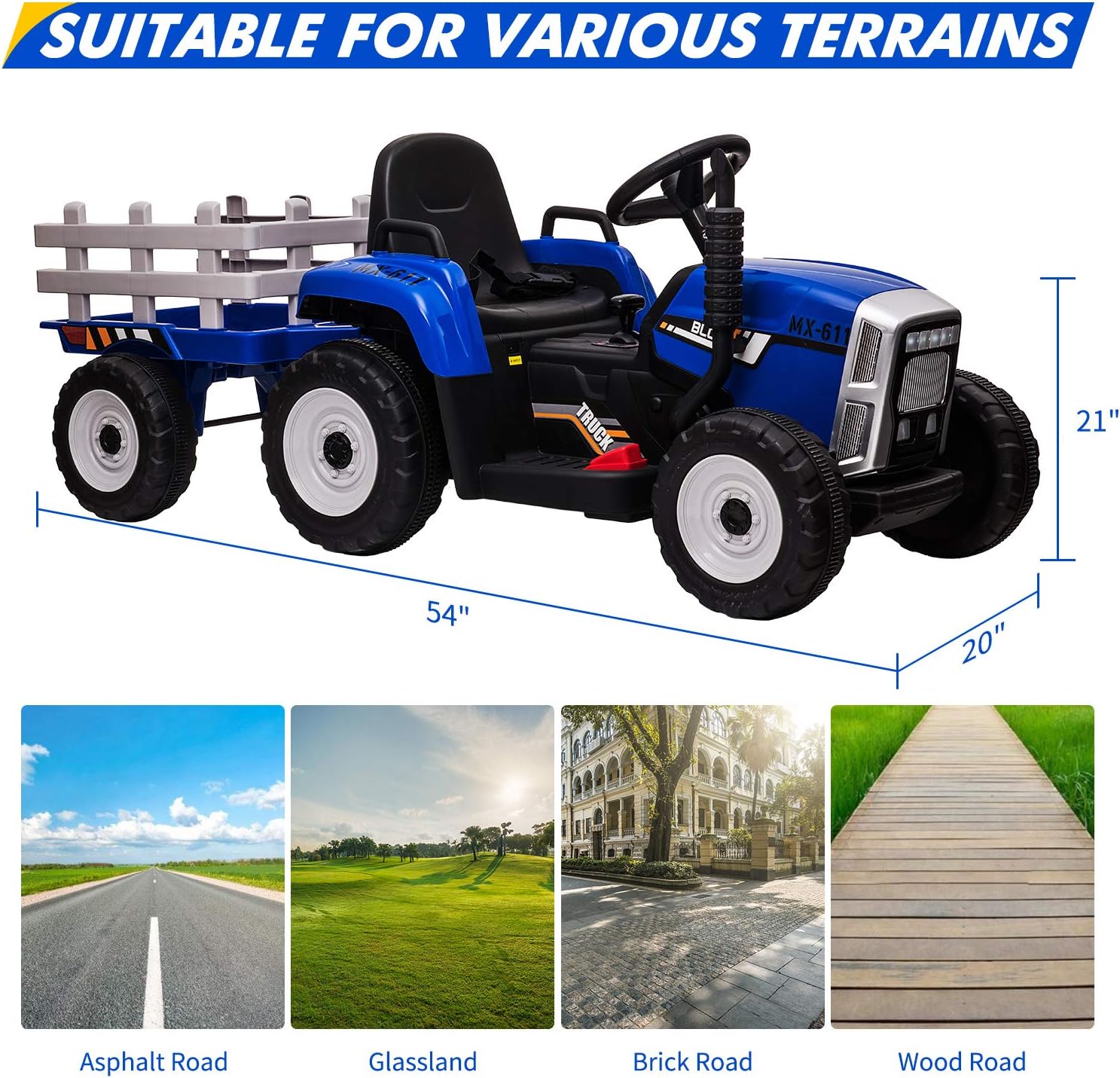 WhizMax 12V Kids Ride-On Tractor With Trailer-Remote Control-2+1 Gear Shift-EVA Treaded Tires-LED Lights-MP3-USB-Blue