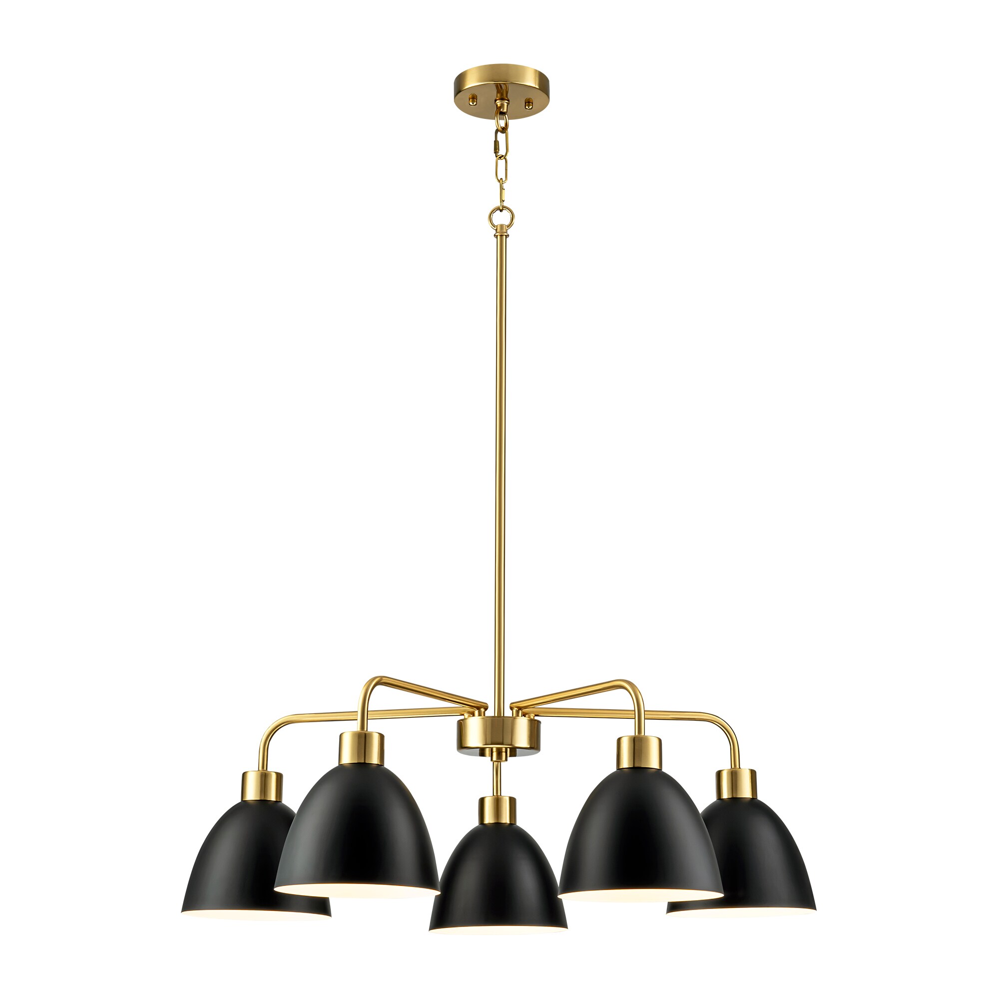 Elevate your space with this striking 5-light linear Sputnik chandelier that fuses bold industrial style with sculptural elegance. Featuring matte black dome shades with crisp white interiors, it offers a warm, focused light and eye-catching contrast. The distinctive 7-shaped arms with gold-tone joints create a modern vintage-inspired silhouette, perfect for dining rooms, kitchens, or open-concept living spaces. Adjustable downrods and sloped ceiling compatibility add versatile installation options.
