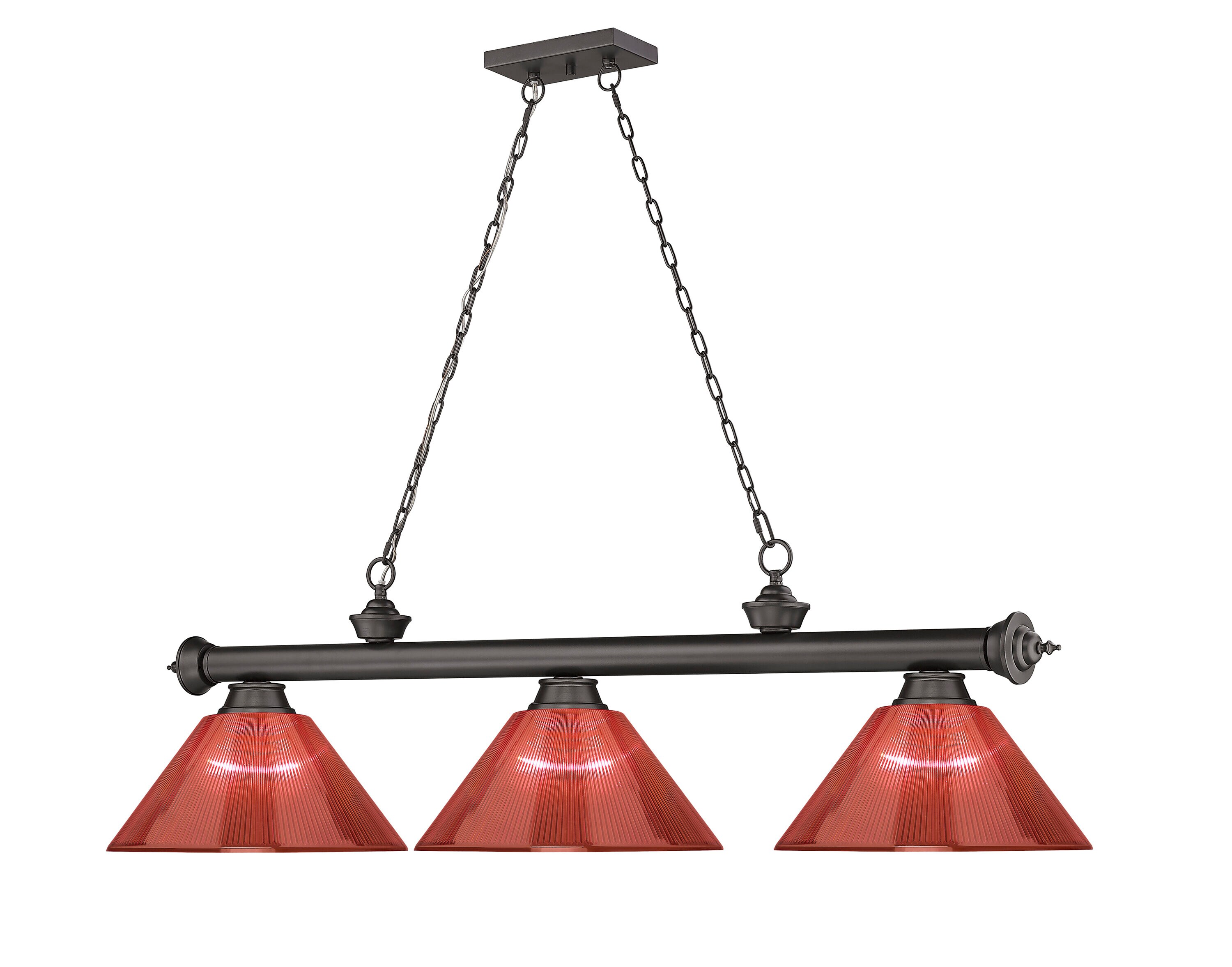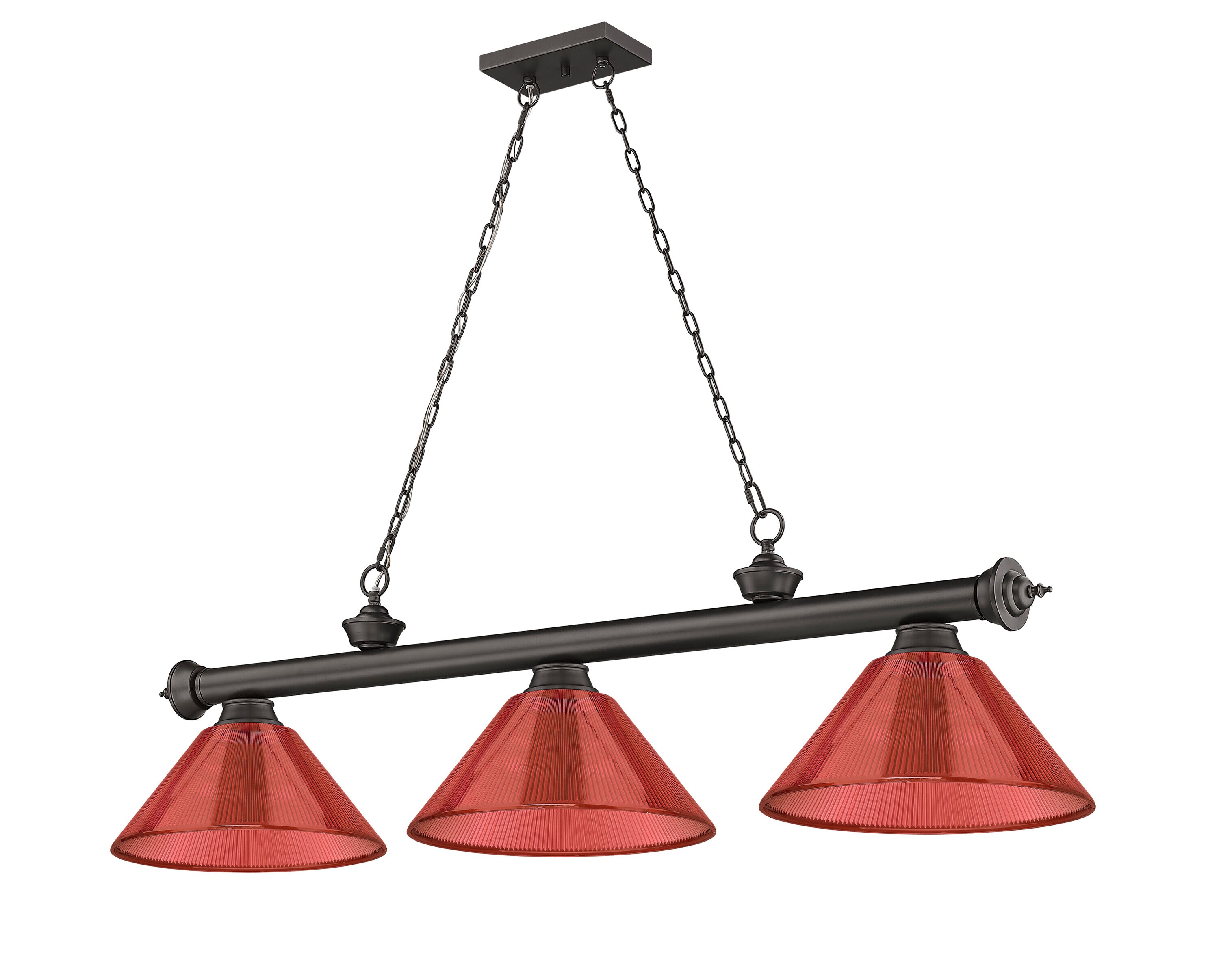 Blending a rich bronze finish with three bright red shades, this traditional metal billiard light adds colorful character to classic interior décor