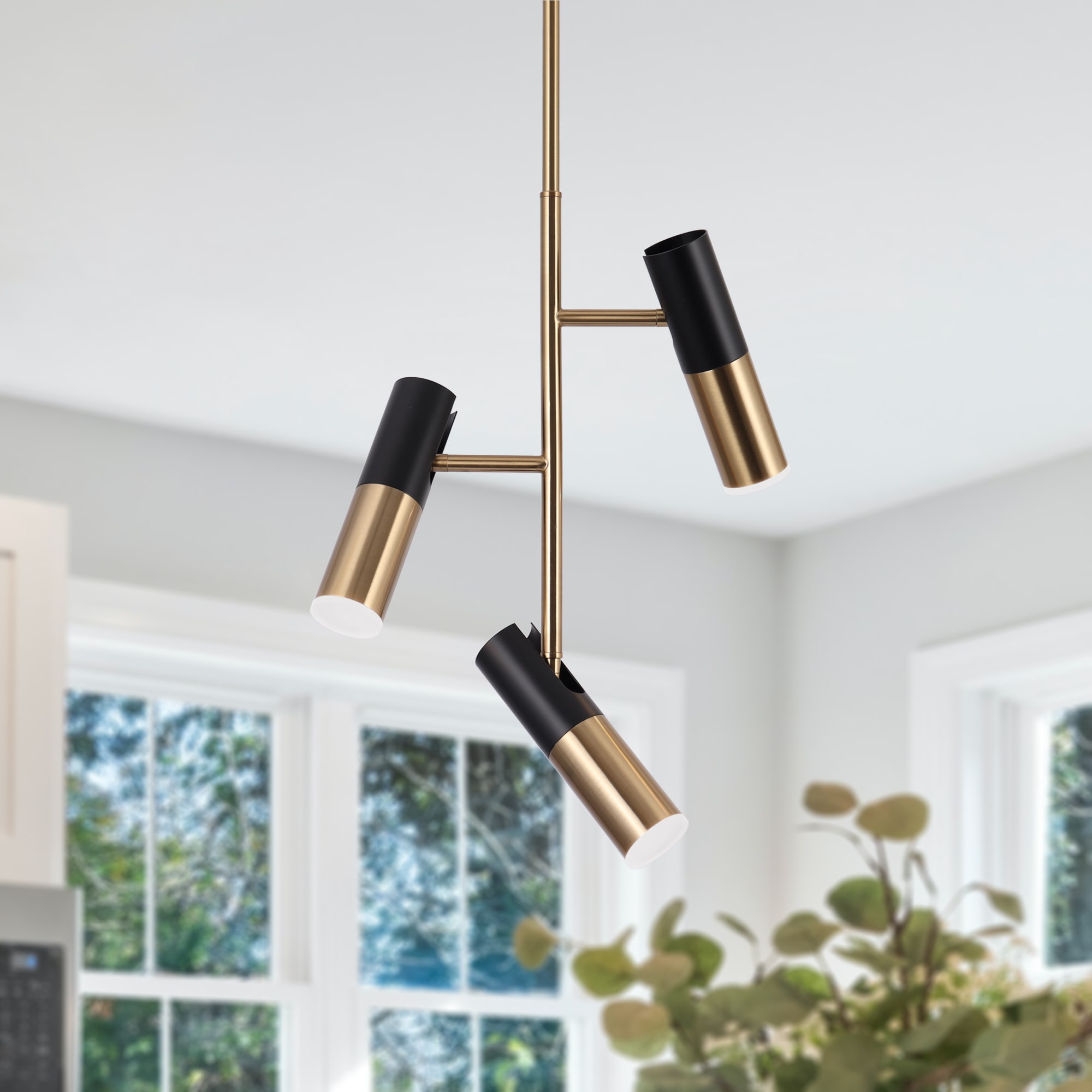 Bring a touch of modern minimalism to your home with this black and gold chandelier. This LED chandelier is crafted of a steel frame finished in matte black and polished brass for a contemporary feel. Simple lines and an open geometric frame lend a fresh bold silhouette that matches well with a casual space or somewhere more modern/contemporary. Perfect for kitchen island, dining room, living room, foyer, staircase, etc.