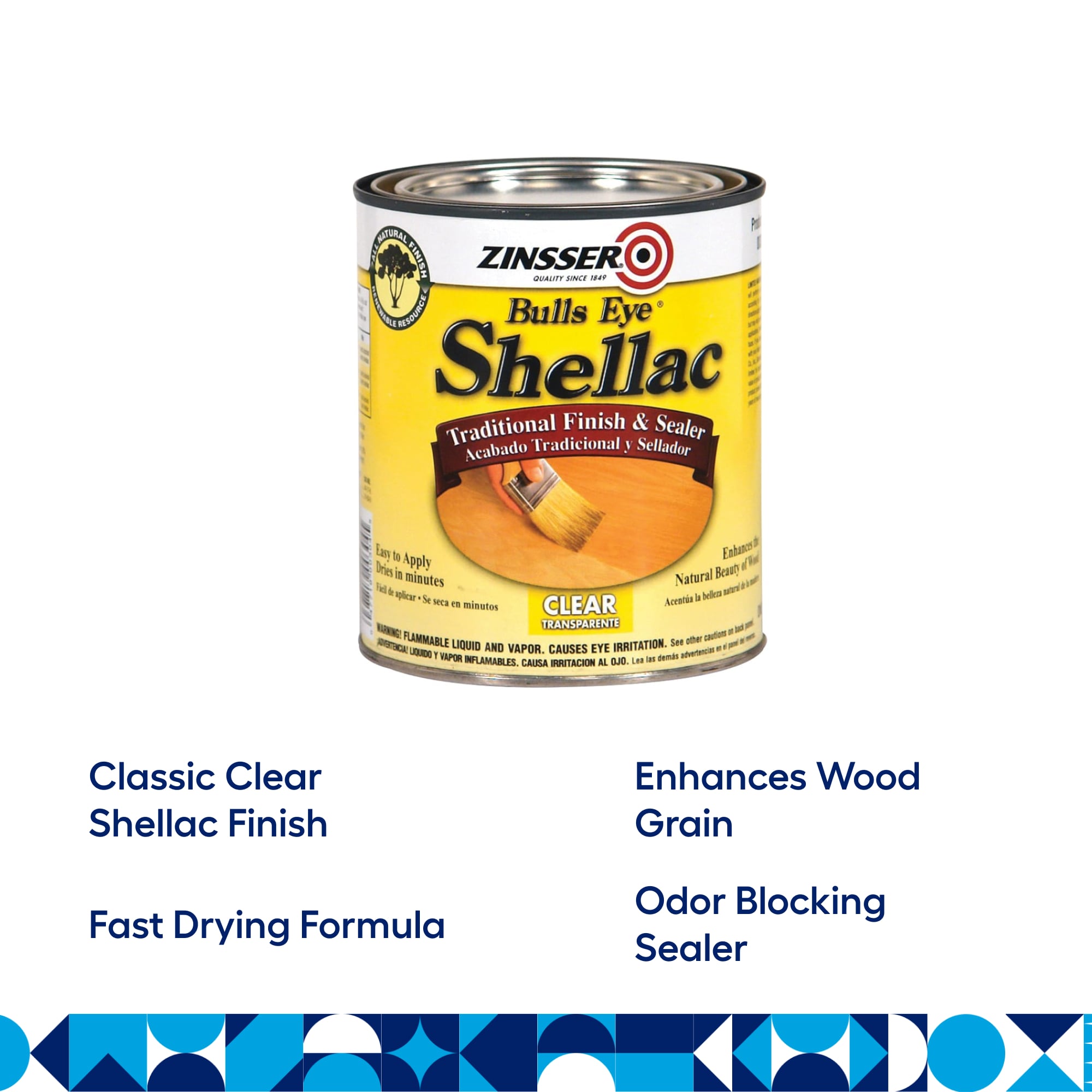 Zinsser Clear Shellac Traditional Finish and Sealer is for wood furniture, floors, paneling, trim, crafts and antique restoration. The shellac dries to the touch in 15 minutes and can be re-coated in 45 minutes. Beautifies wood with a lustrous glow that will not darken with age.