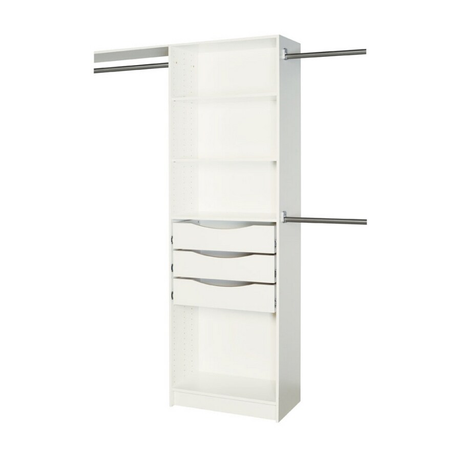 Contains one tower, 3 adjustable shelves, three expandable rods, three access drawers and one 48'' top shelf