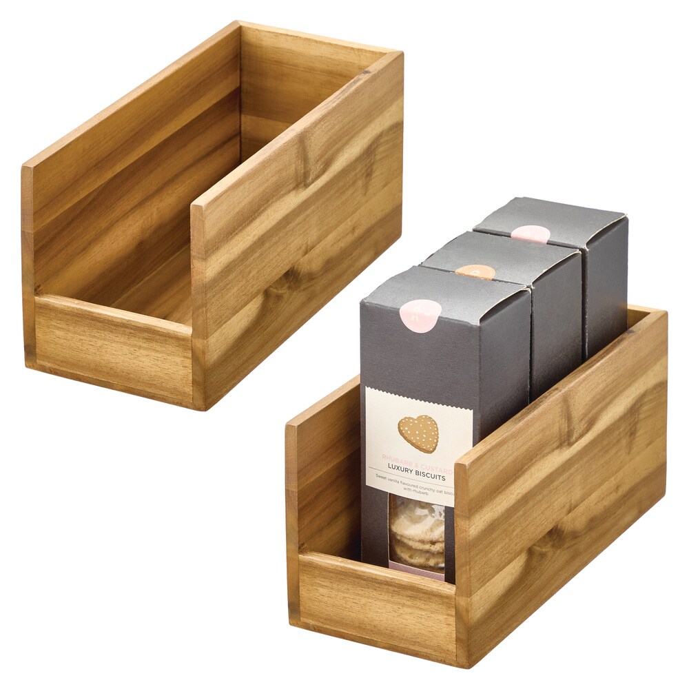The iDesign Acacia Wood Open-Front Bin is the perfect solution for streamlining your kitchen. A large cutout offers easy, one-handed access to pantry staples, making it easy to corral everything from boxed foods to baking essentials and more. This extra-wide opening also keeps your belongings visible and accessible to make grabbing what you need super simple. Their perfectly straight sides allow them to sit flush when positioned side by side, maximizing valuable shelf space. Crafted from natural, moisture-resistant acacia wood, this durable construction ensures longevity, making it suitable for daily use. The acacia wood construction blends elegance and durability, bringing a natural aesthetic to your storage solutions. Not just limited to the kitchen, this versatile design suits all your storage needs and organizes other areas of the home, from craft corners to home offices or anywhere you need to keep things tidy and clutter-free. To maintain its pristine appearance, simply clean with a damp cloth