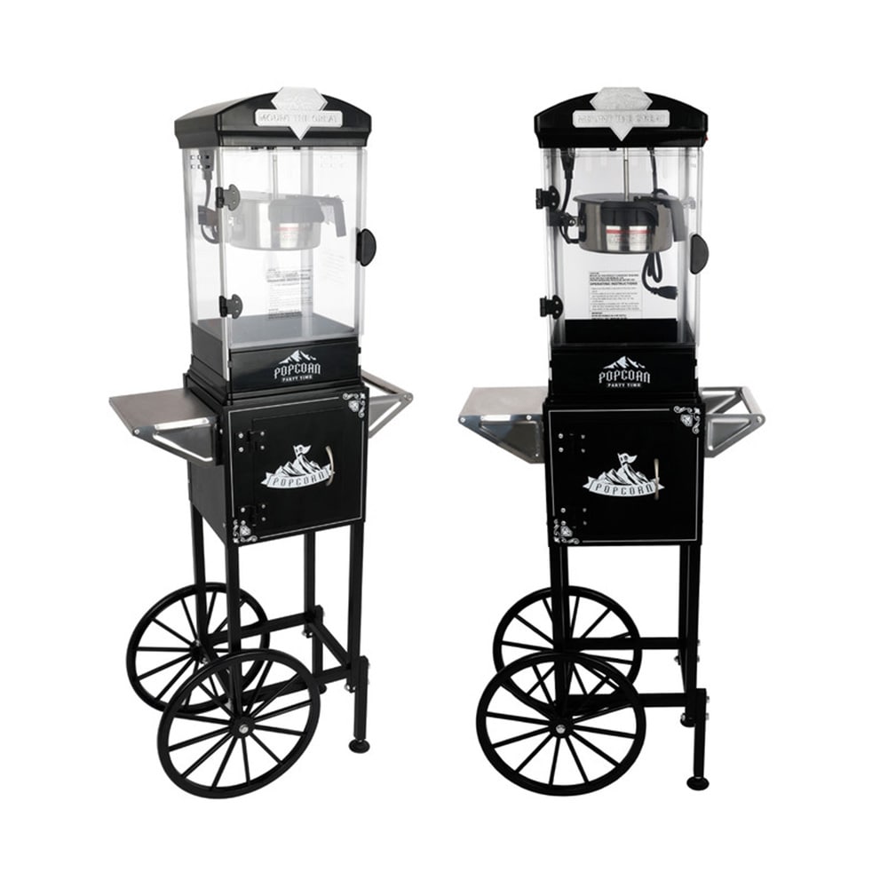 - •Portable Popcorn Machine Cart: The popcorn maker machine is mounted on stainless steel cart , which is stable and easy totransport and repair, The cart also has a storage cabinet foreasy storage and convenience